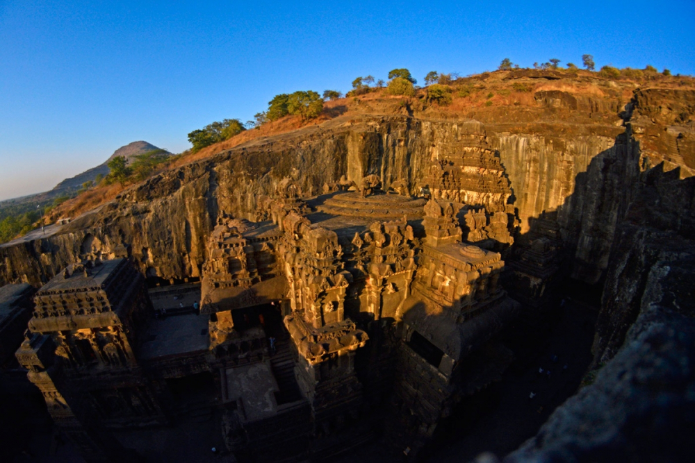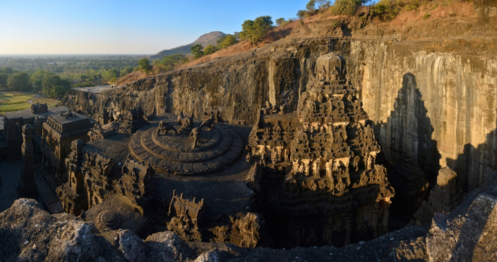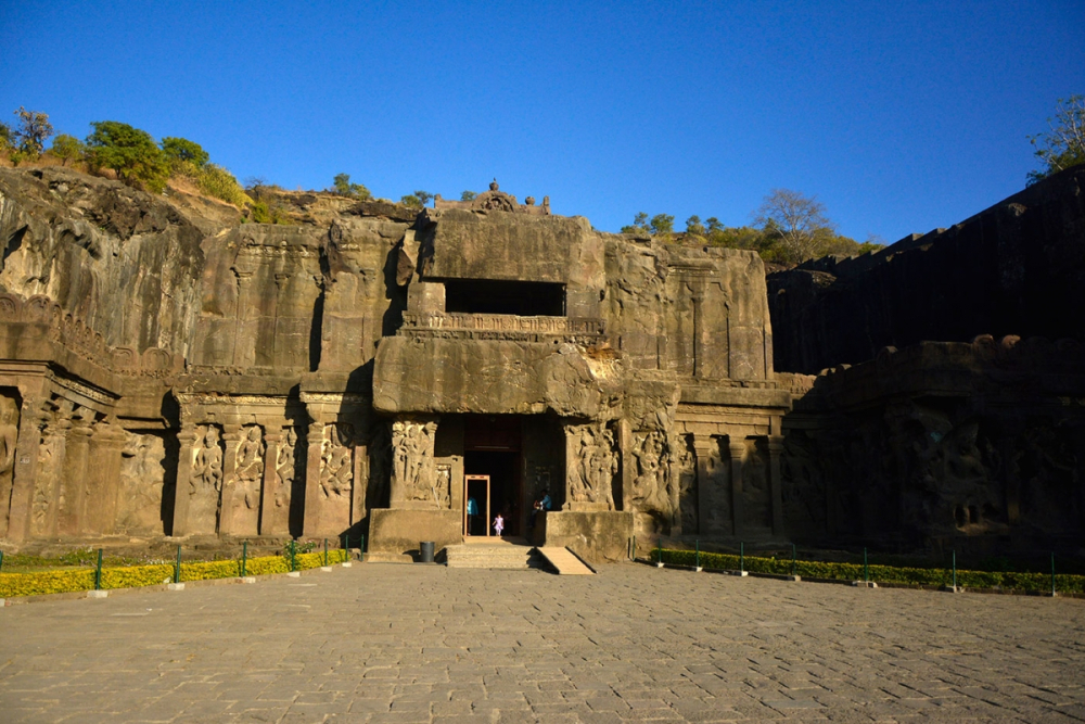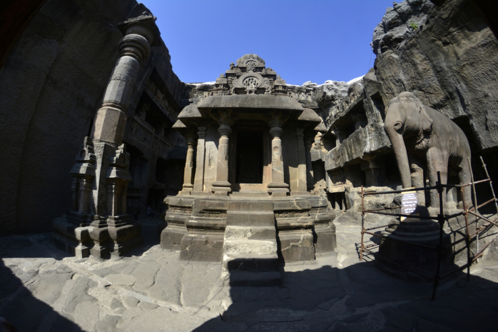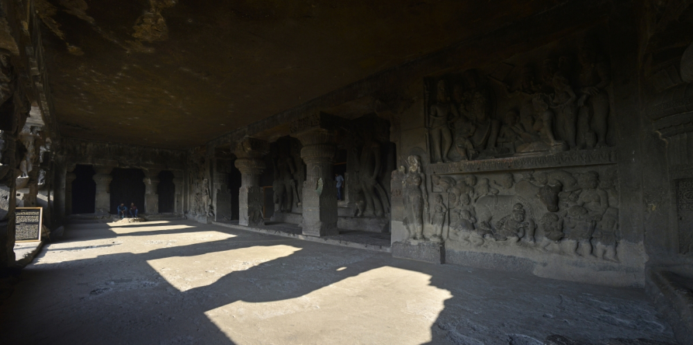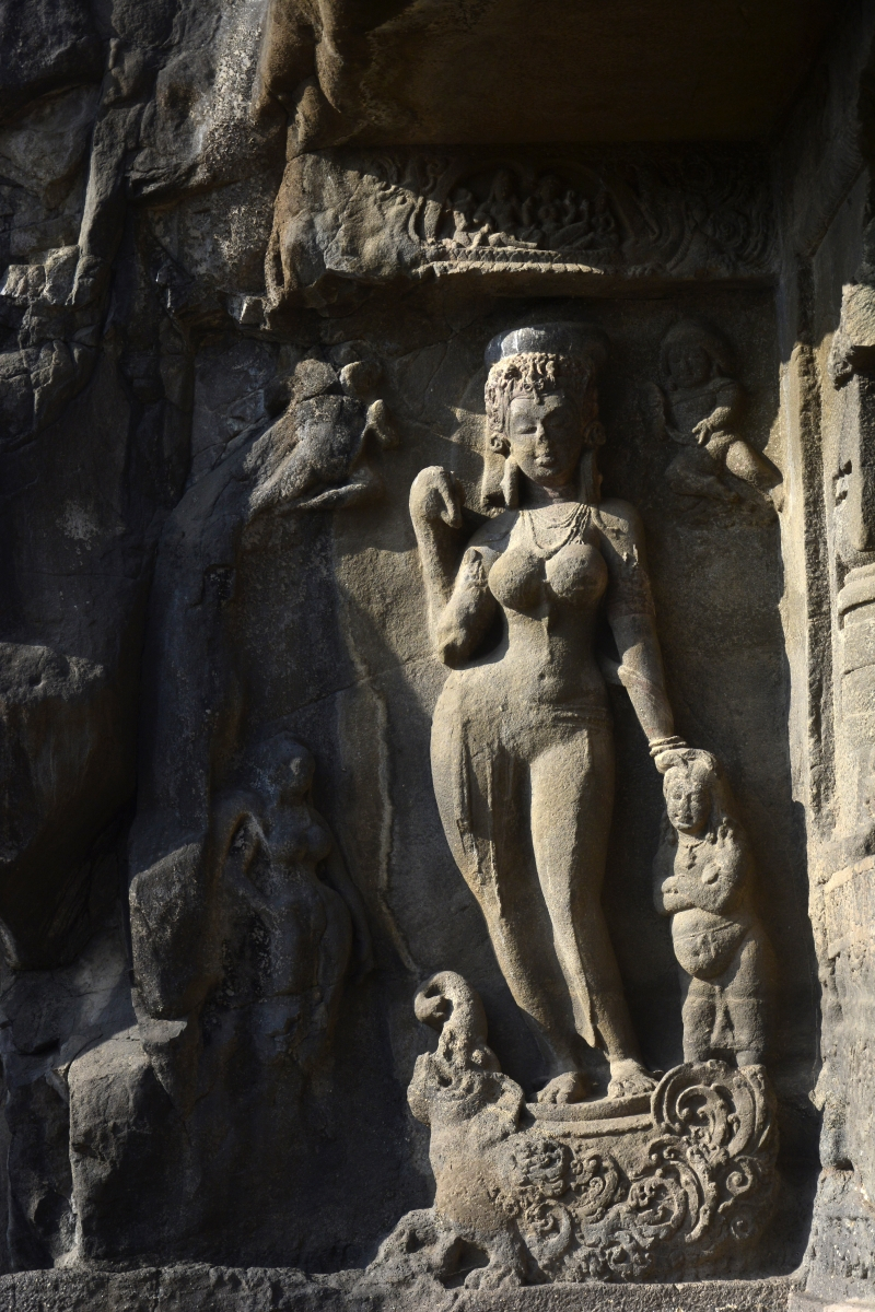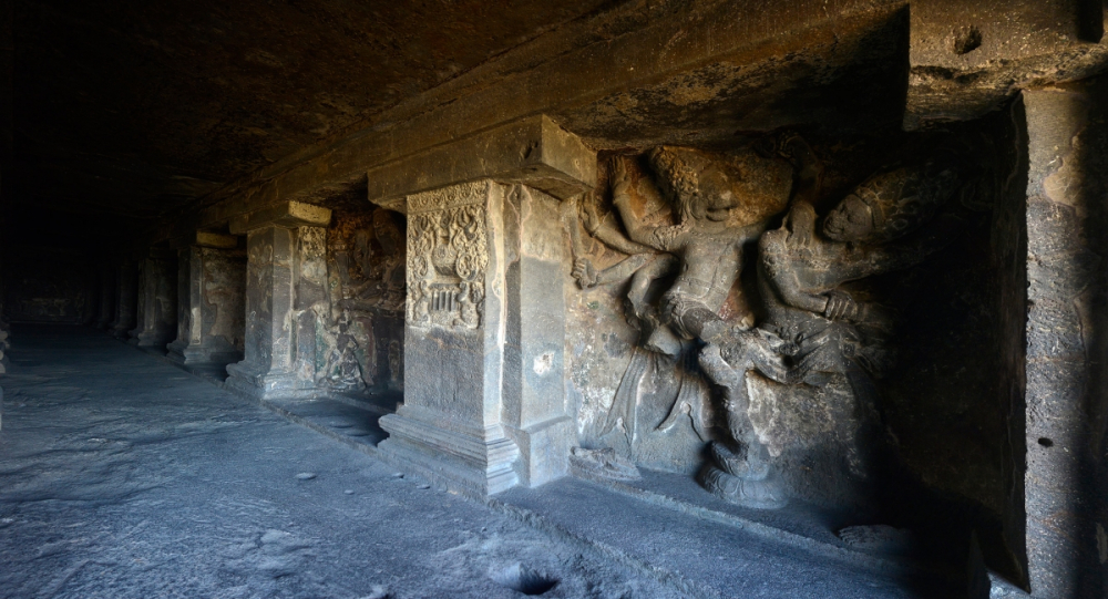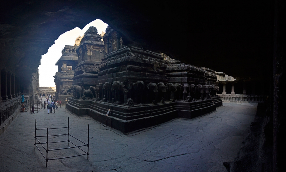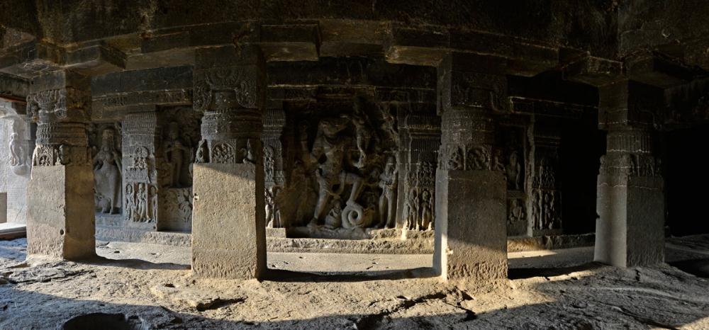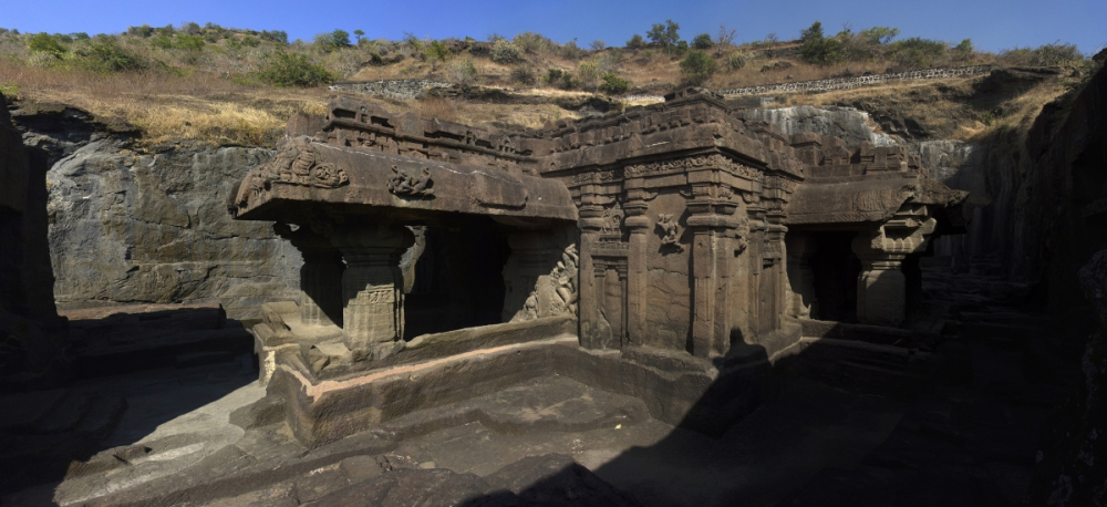 Another remarkable aspect of Ellora is that here, in the same space, the craftsman completely turns around the conventional understanding of cave temple architecture, starting with caves with just mukha mandapa and shrine as in Cave 28 to creating a temple fully carved out of rock as in Kailasanatha temple, Cave 16. Ellora also successfully combines the penetrative and deductive approaches of cave carving in India. Penetrative method is the conventional approach seen in Western India, like at Ajanta where the carver penetrates into the rock surface and creates space. On the other hand, deductive method has been practiced in Eastern India at the monuments of Udaygiri [Odisha], and at Mahabalipuram [Tamil Nadu]. Here the carver imagines the exterior form of the cave and systematically removes the rock to achieve that form. The qualities of rock in both regions, the harder rock in eastern India and softer rock in western India, have contributed immensely to the process of carving. This amalgamation of different traditions which took almost 700 years to come about can be seen at Ellora itself which makes it a unique monument in India.