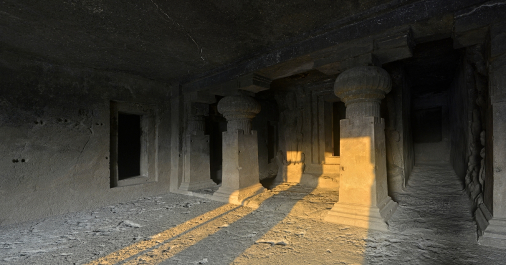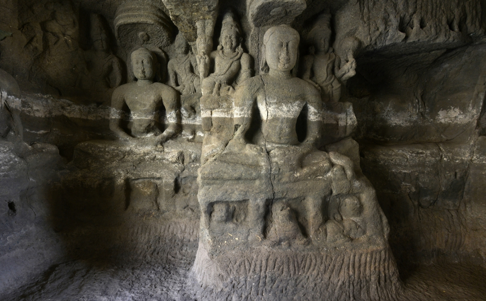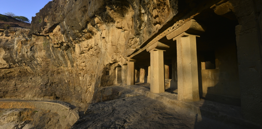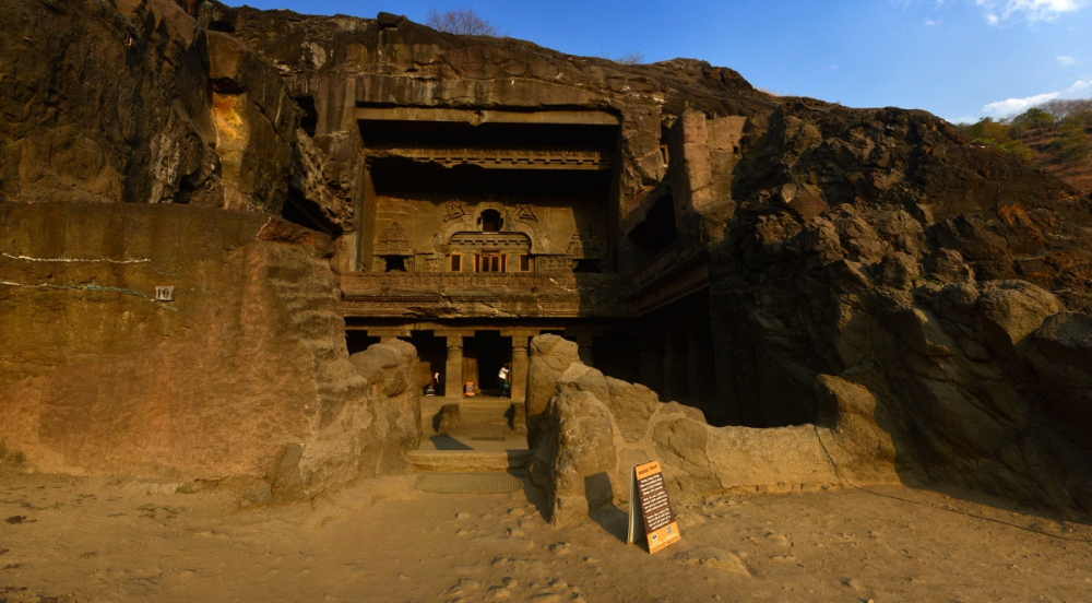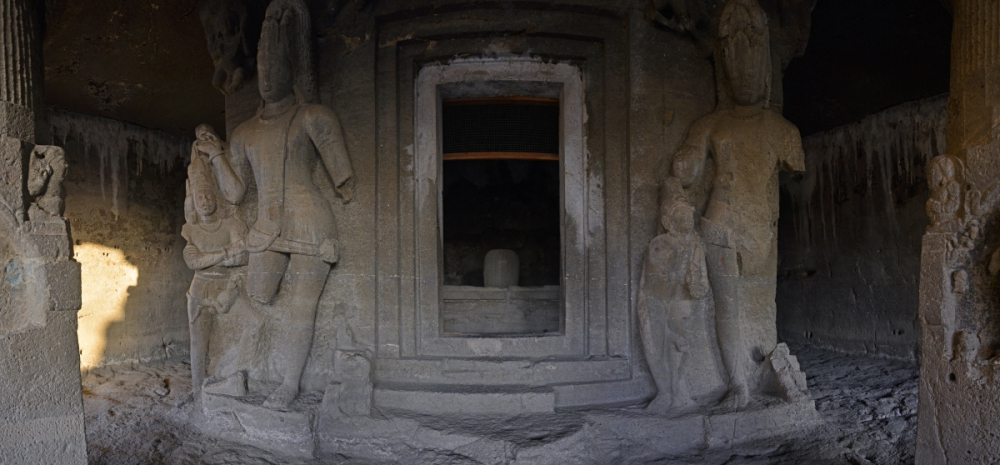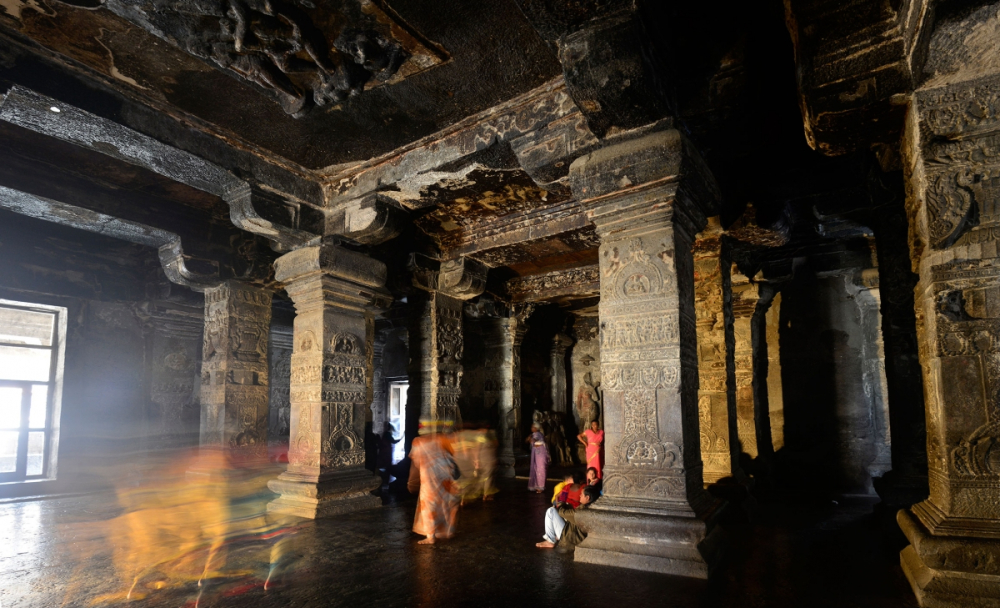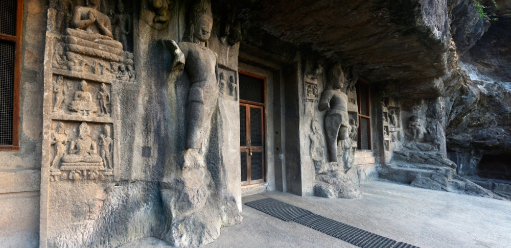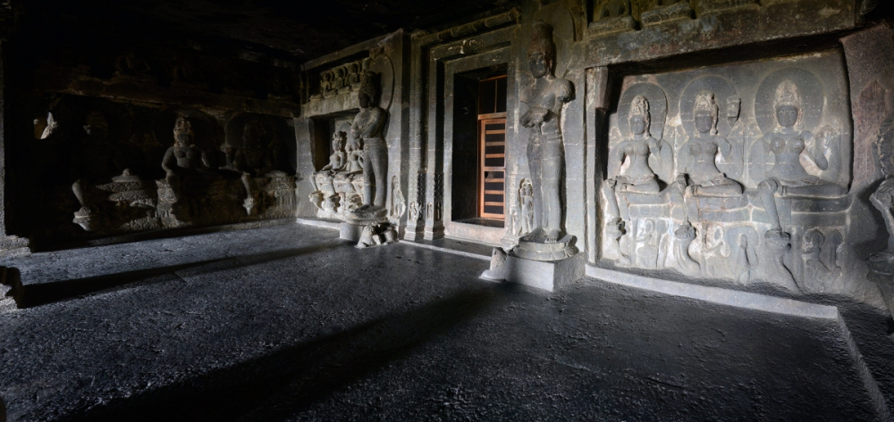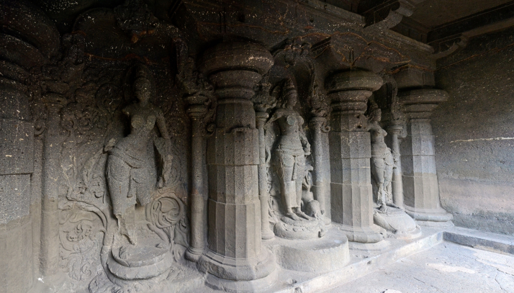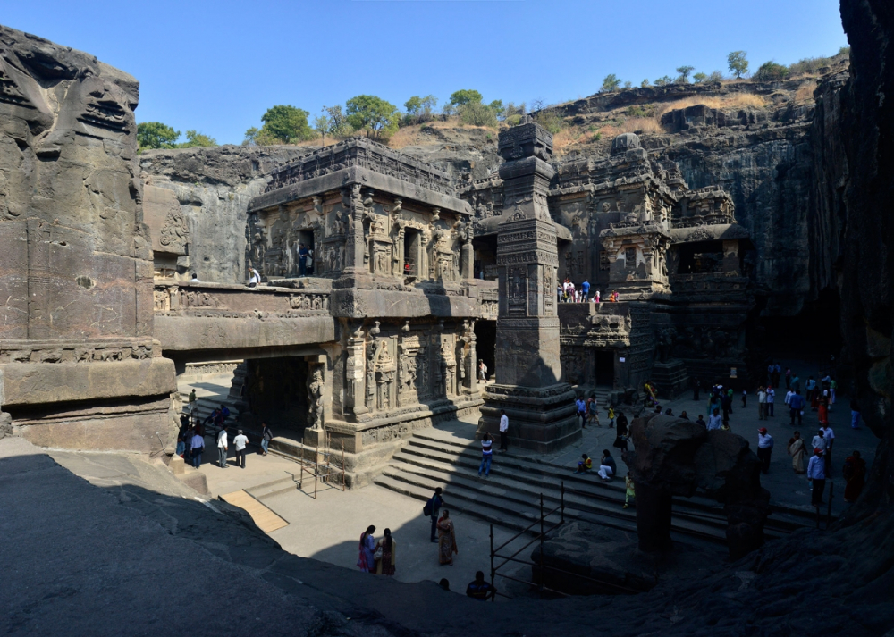 Another remarkable aspect of Ellora is that here, in the same space, the craftsman completely turns around the conventional understanding of cave temple architecture, starting with caves with just mukha mandapa and shrine as in Cave 28 to creating a temple fully carved out of rock as in Kailasanatha temple, Cave 16. Ellora also successfully combines the penetrative and deductive approaches of cave carving in India. Penetrative method is the conventional approach seen in Western India, like at Ajanta where the carver penetrates into the rock surface and creates space. On the other hand, deductive method has been practiced in Eastern India at the monuments of Udaygiri [Odisha], and at Mahabalipuram [Tamil Nadu]. Here the carver imagines the exterior form of the cave and systematically removes the rock to achieve that form. The qualities of rock in both regions, the harder rock in eastern India and softer rock in western India, have contributed immensely to the process of carving. This amalgamation of different traditions which took almost 700 years to come about can be seen at Ellora itself which makes it a unique monument in India.