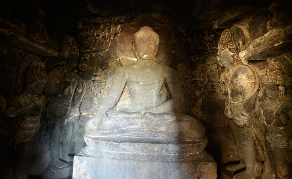 Cave 15 was begun as a Buddhist monastery, probably towards the middle of the eighth century. It has an open court with a free-standing monolithic mandapa in the middle and a two-storeyed excavated temple at the rear. The layout of the temple, with its columned aisles and carved figures is closely related to the Buddhist excavations (Caves 11 and 12). An inscription on the back wall of the monolithic Nandi mandapa records a donation of the Rashtrakuta king Dantidurga.