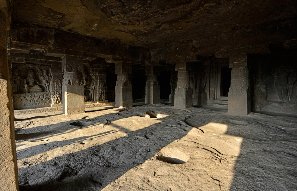 Ellora's earliest excavations date from the sixth century, during the Vakataka/ Pre Kalacuri era. Dhumar Lena (Cave 29) belongs to the Kalacuri phase and is closely related to the very similar cave-temple at Elephanta. Another Kalacuri period monument at Ellora is Ramesvara (Cave 21, Fig.4) and probably the Visvakarma (Cave 10, Fig.5). Among the excavations datable to Pre-Imperial Rashtrakuta/Chalukyan period in the seventh and early eighth centuries are the twin Do Tal and Tin Tal (Caves 11 and 12) along with Ravan ki Khai (Cave 14) and Cave 17. The next phase of activity coincides with the Rashtrakuta period in the eighth to twelfth century AD. Two inscriptions link Rashtrakuta rulers with Ellora: the inscribed grant of Dantidurga in Dasavatara (Cave 15) (Altekar 1934), and a set of copper plates discovered at Baroda mentioning King Krishna’s involvement in the excavation of Kailasa (Cave 16) (Bhandarkar 1927). No other inscriptional evidences are available regarding the political affiliation of Ellora.