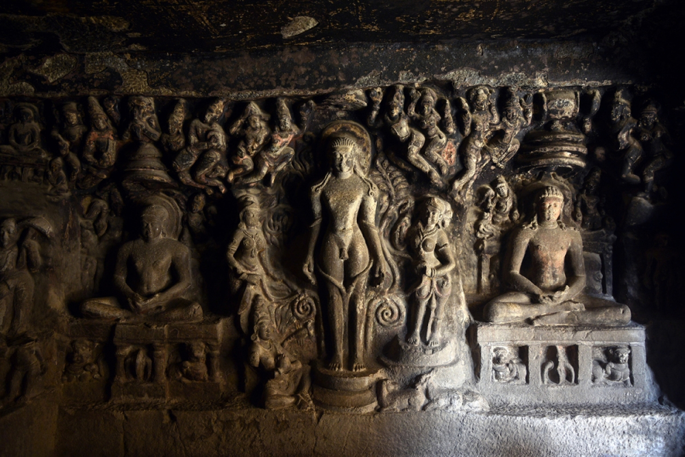 Caves belonging to the Jain religion bring the history of the site of Ellora right into medieval period. The architecture in accordance to the spirit of the age is much complex and as intricate as it can be. The monolith in the centre court of Jain group introduces a new type of Sarvatobhadra shrines which will be extensively used in medieval Karnataka. This along with contemporaneous Dhamnar and related monuments in Malwa will be last expressions of monolith temples in India.