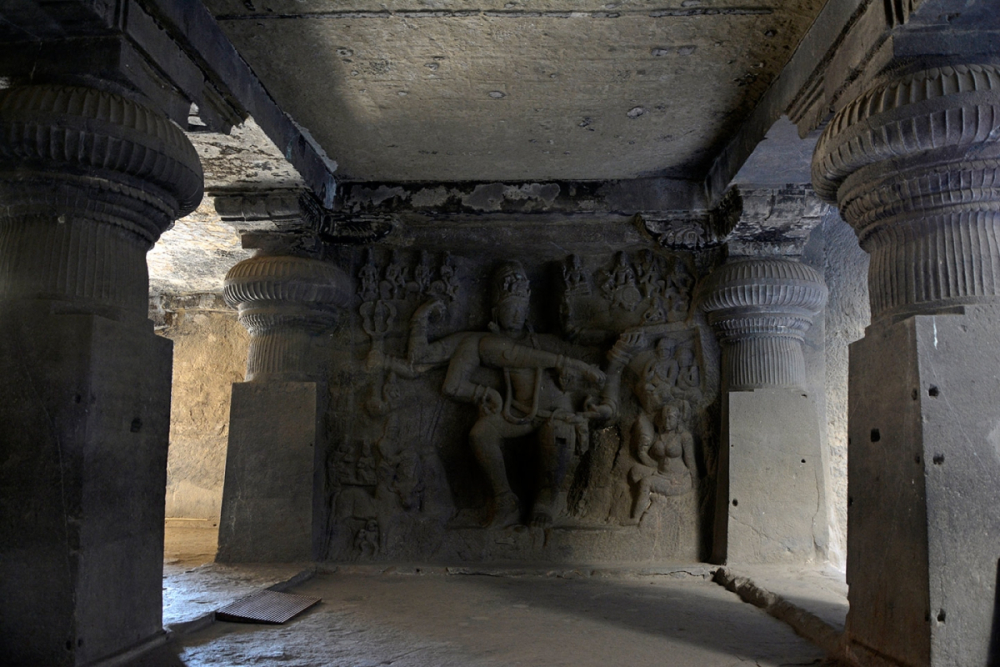 Relationship between the design of Dhumar Lena (Cave 29) and the main cave in Elephanta island has already been pointed out. As at Elephanta, access to the columned interior of the Ellora monument is from three sides (Fig.14). There is an open court on the west. Seated lions guard the steps to the three entrances. The columns of the spacious mandapa have part-fluted bulbous shafts and cushion capitals. Towards the rear wall is a detached square sanctuary with four doorways, each with a pair of tall guardian figures accompanied by female figures. A monolithic linga is enshrined within. Large-scale panels on the walls of the outer aisles depict Andhakasuravadhamurti, Ravananugrahamurti, Nataraja (Fig.15), Lakulisa, Kalyanasundaramurti, and Siva Parvati playing dice. Placement of the sculpted panels are almost the same as at Elephanta but crudely carved. River goddesses are positioned outside the north and south entrances.