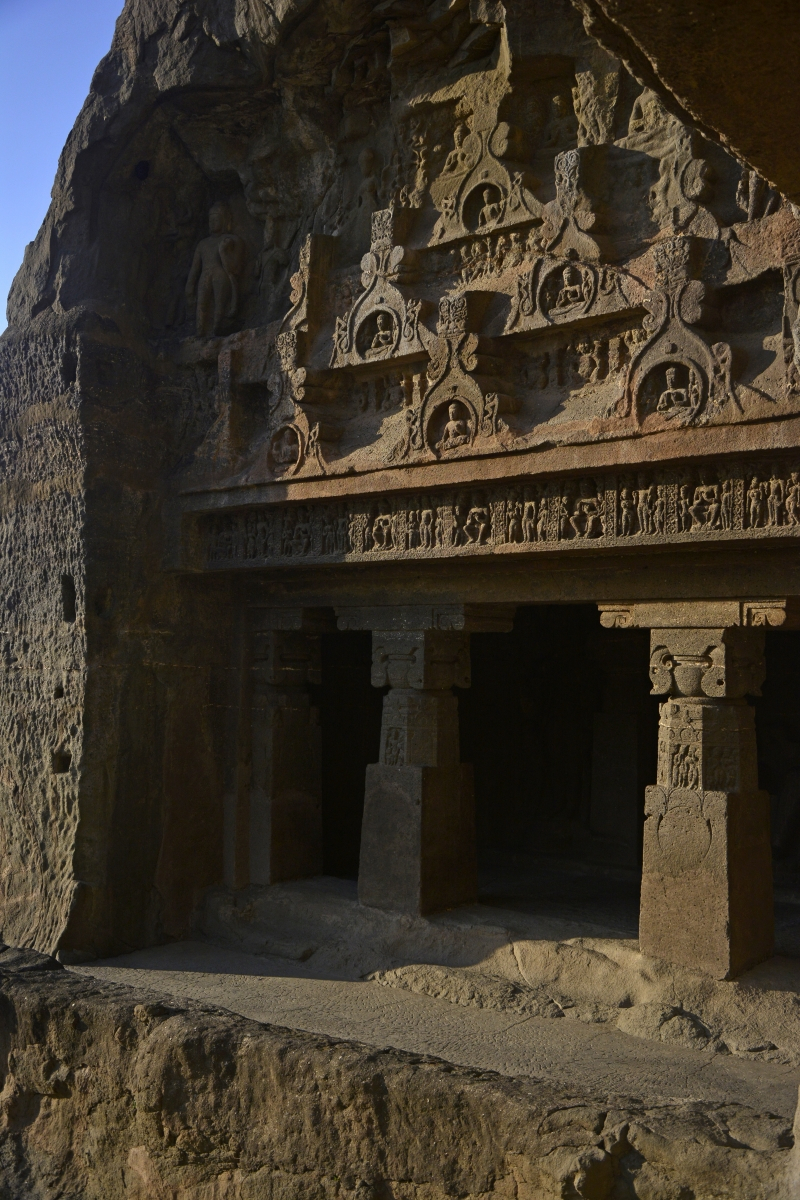 This is the last noteworthy chaitya hall of the Deccan cave-temple series (Fig.5). Like other Buddhist examples, this too dates from the seventh century and is named after the mythical architect of the gods. The hall is positioned at one end of an excavated court that is entered through a gateway. A portico on three sides is raised on a basement carved with animals. The columns have partly fluted shafts, pot and foliage capitals, and plain brackets. A long frieze depicting a hunting scene appears above. At the rear end of the court is an upper gallery with parapet wall embellished with amorous couples and scrollwork. The main verandah was intended to have subsidiary shrines at either end; the one to the left is incomplete. The antechamber walls to the right are carved with images of Buddha and goddesses. The hall itself is entered through three doorways at the rear of the verandah. Access to an upper gallery is provided by steps cut into the left side of the verandah. The facade behind this upper gallery consists of a doorway flanked by carvings of deities, while the side niches contain Bodhisattvas with female attendants (Fig.13). Both niches are capped with pyramidal pediments composed of arch-like motifs. The pediment over the doorway is larger and contains a chaitya window between arched motifs. Flying celestial figures, naga deities with coiled bodies, and scrollwork adorn this scheme. Suspended over the facade is a ceiling with rock-cut beams.