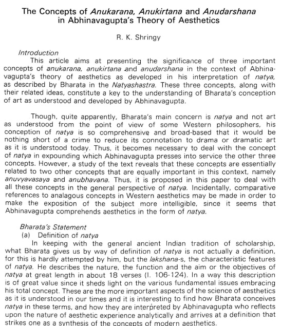The article is a study of the concepts of Anukarana, Anukirtana and Anudarshana in Abhinavagupta's theory of aesthetics, based on his study of Bharata's Natyashastra.