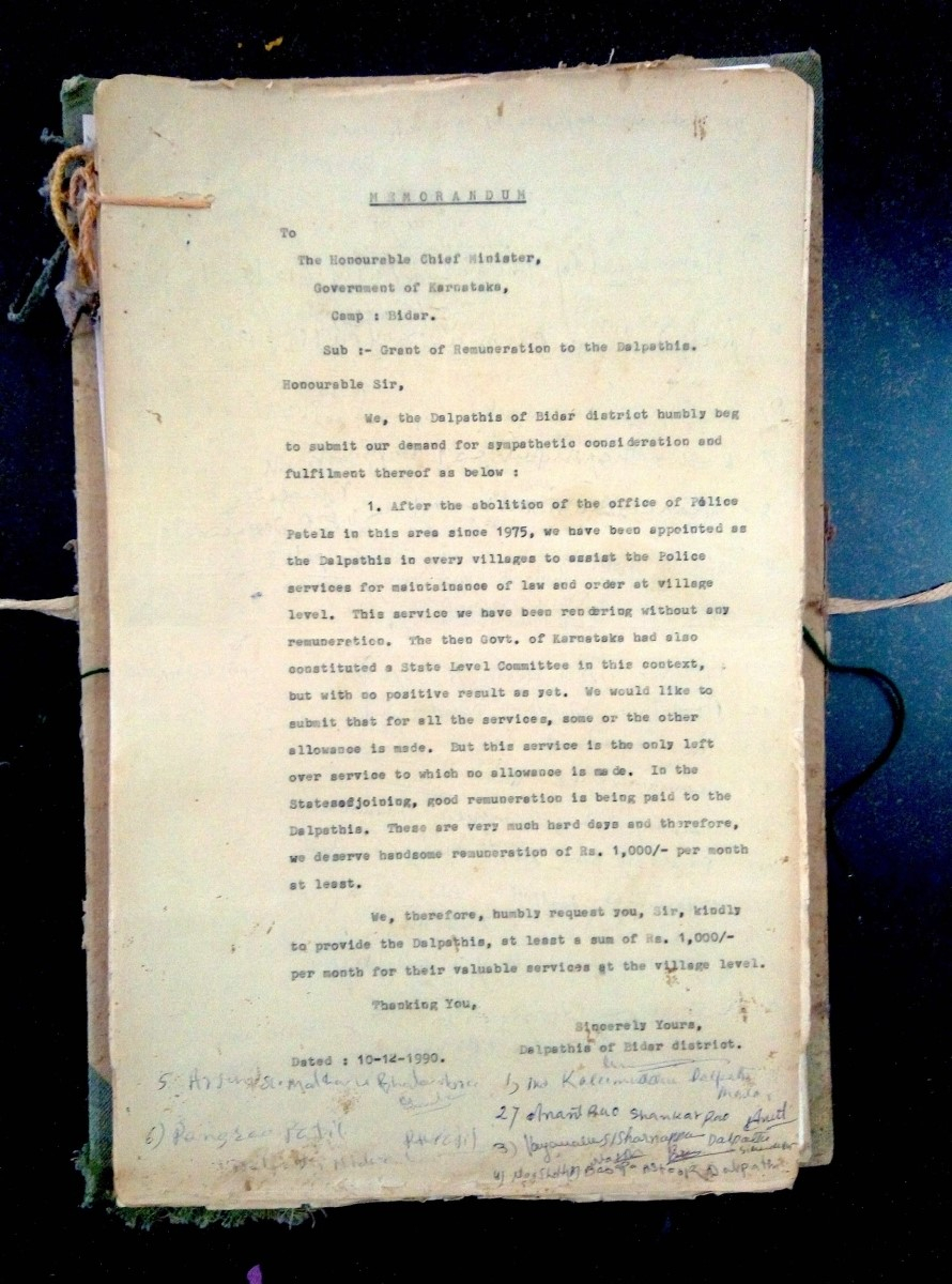 Fig 2. A Memorandum typed and sent to the Chief Minister in 1990 on behalf of the Dalapathis of Bidar, requesting a fair honorarium for their services. A mention of the abolishment of the Police Patel is made perhaps because the roles of the Police Patel and that of a Dalapathi are seen as the same, but remuneration and pension were offered only to the former.