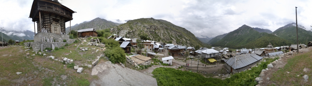 Fig. 1: Panorama showing an old tower temple sitting at the highest point and typical settlement draped around the contoured sunny slopes of the hills in Chitkul, Kinnaur.