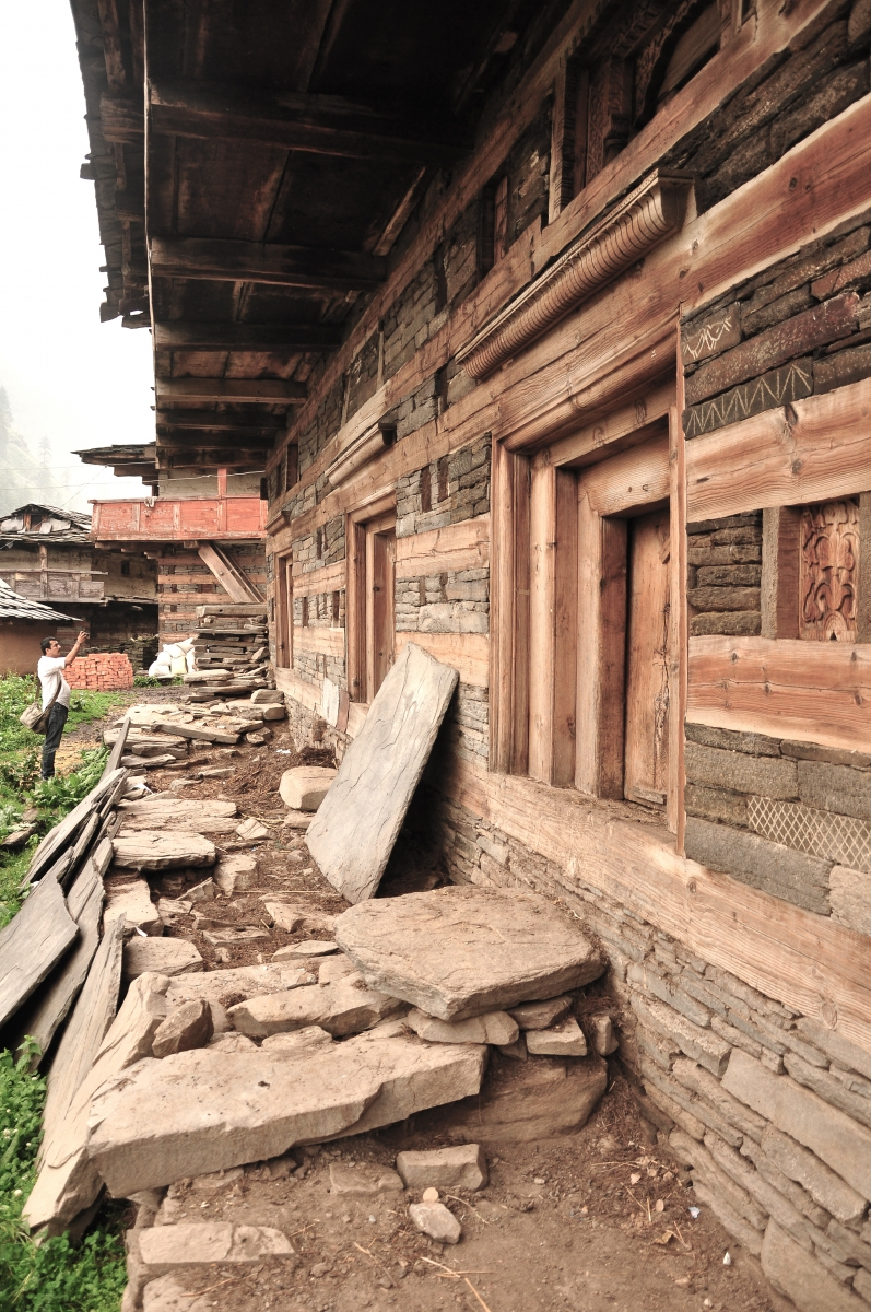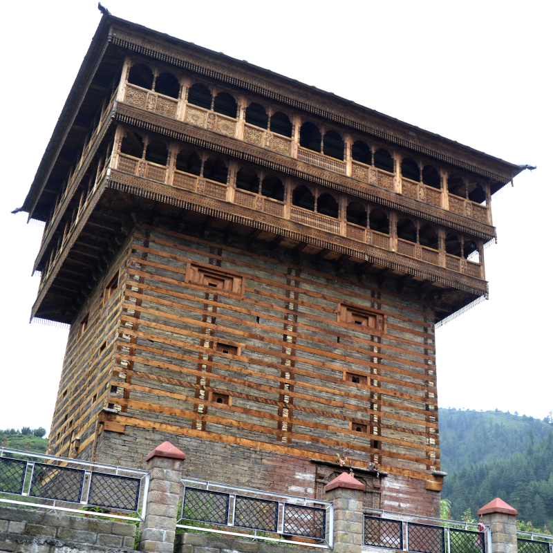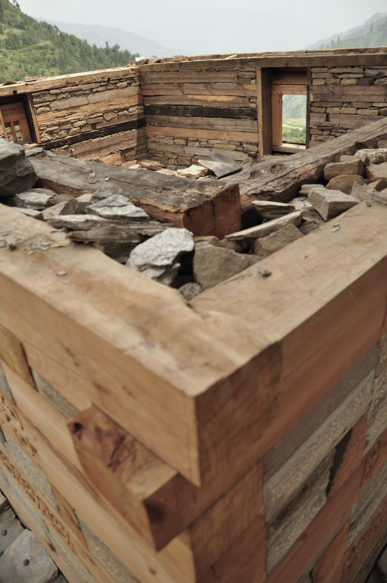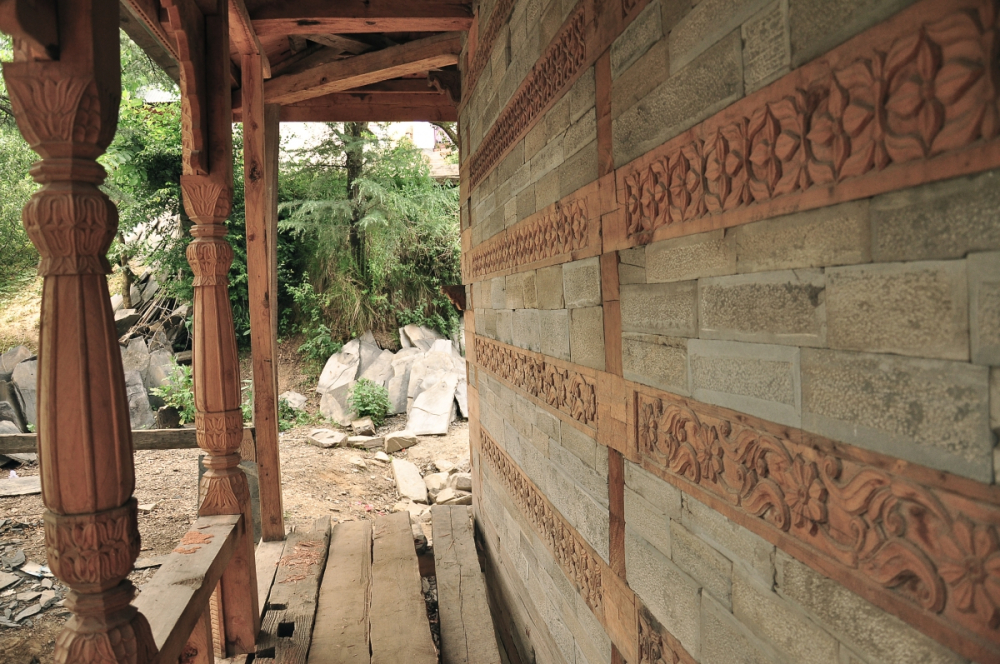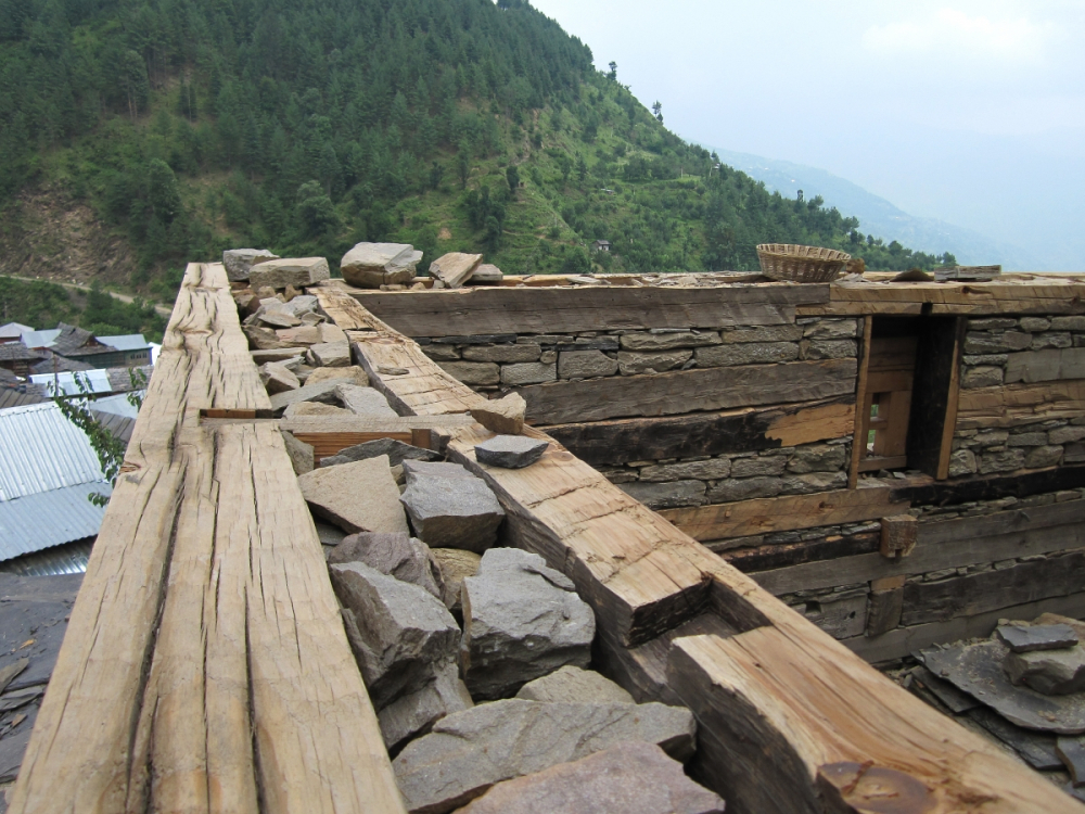 The widespread technique of kath-khuni construction can be found in buildings of various scales, from quite large darbargadhs and kots, to intricate and majestic temples, to modest houses and even small standalone structures like granaries. With its characteristic layered interlocking of wood-and-stone, topped by slate roofs, the kath-khuni buildings are easily recognizable. The technique relies upon a limited range of materials which, in turn, has evolved into a distinctive aesthetics of hard and soft materials, of cold and warm colours, of rough and smooth textures.