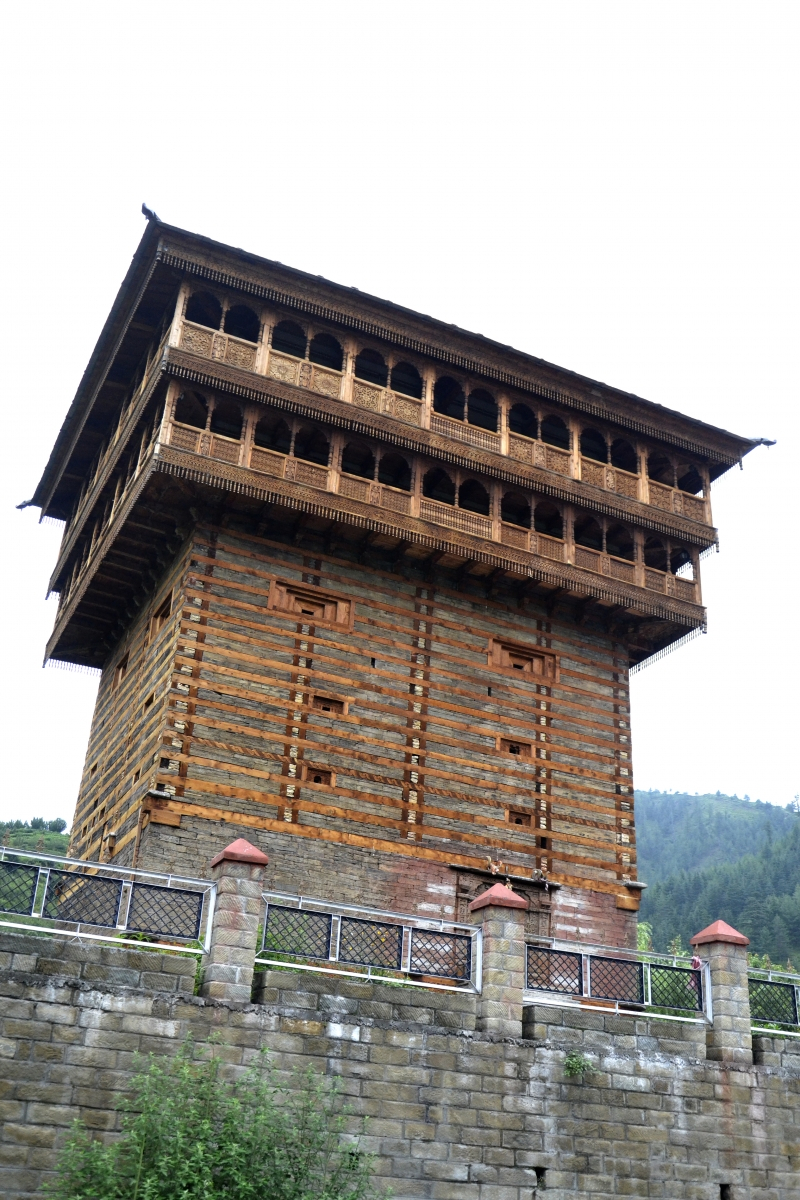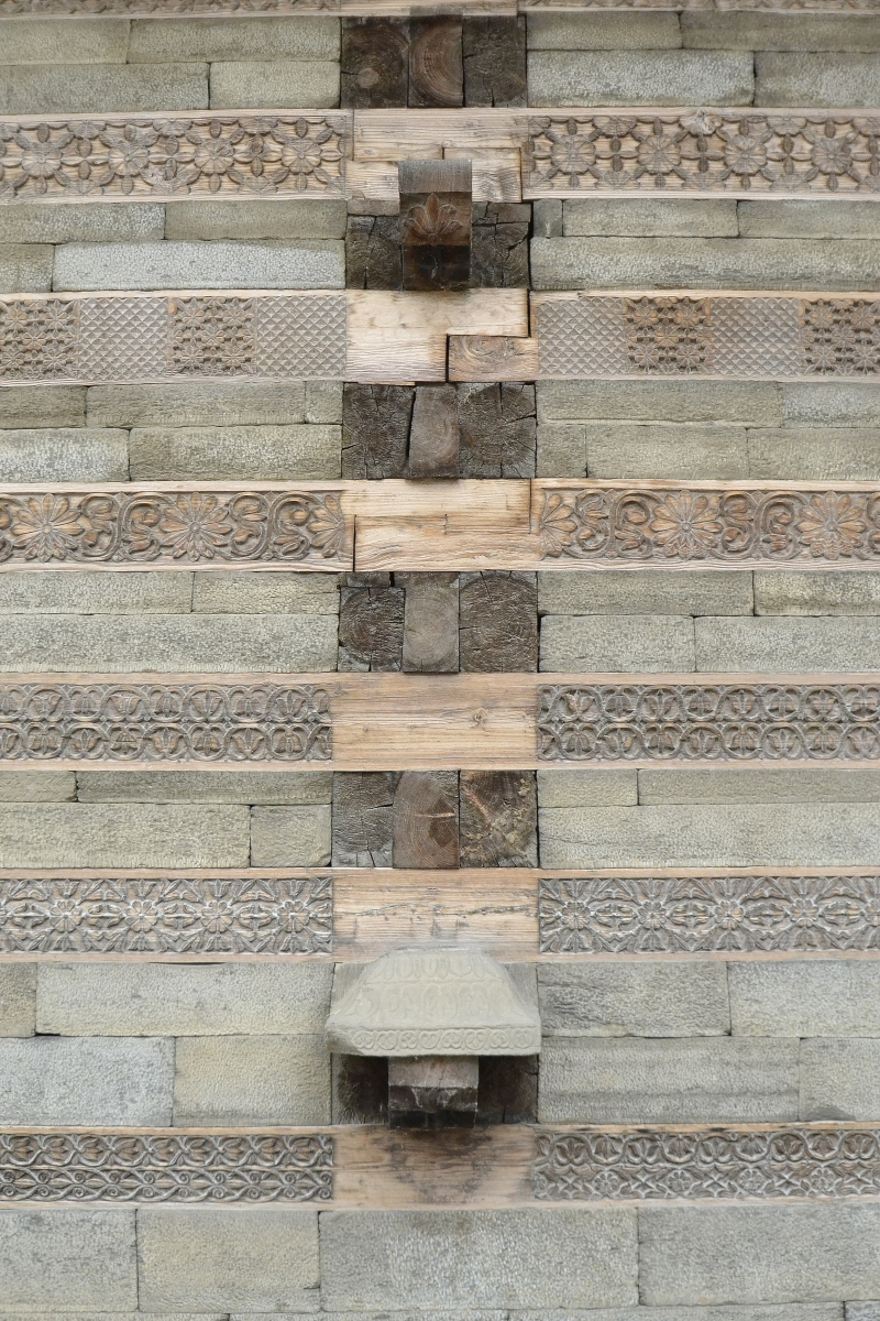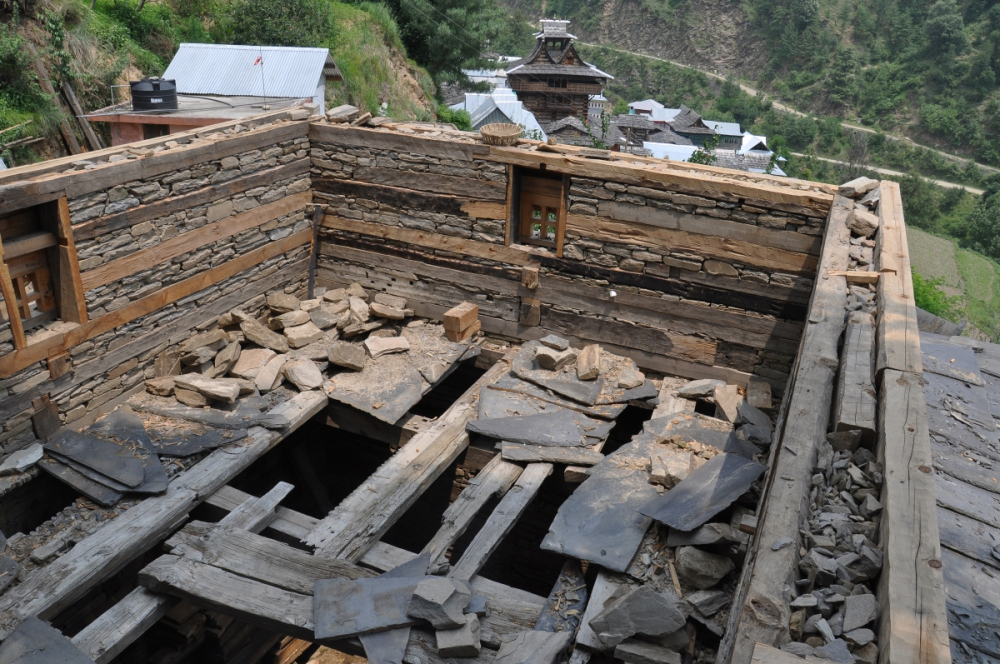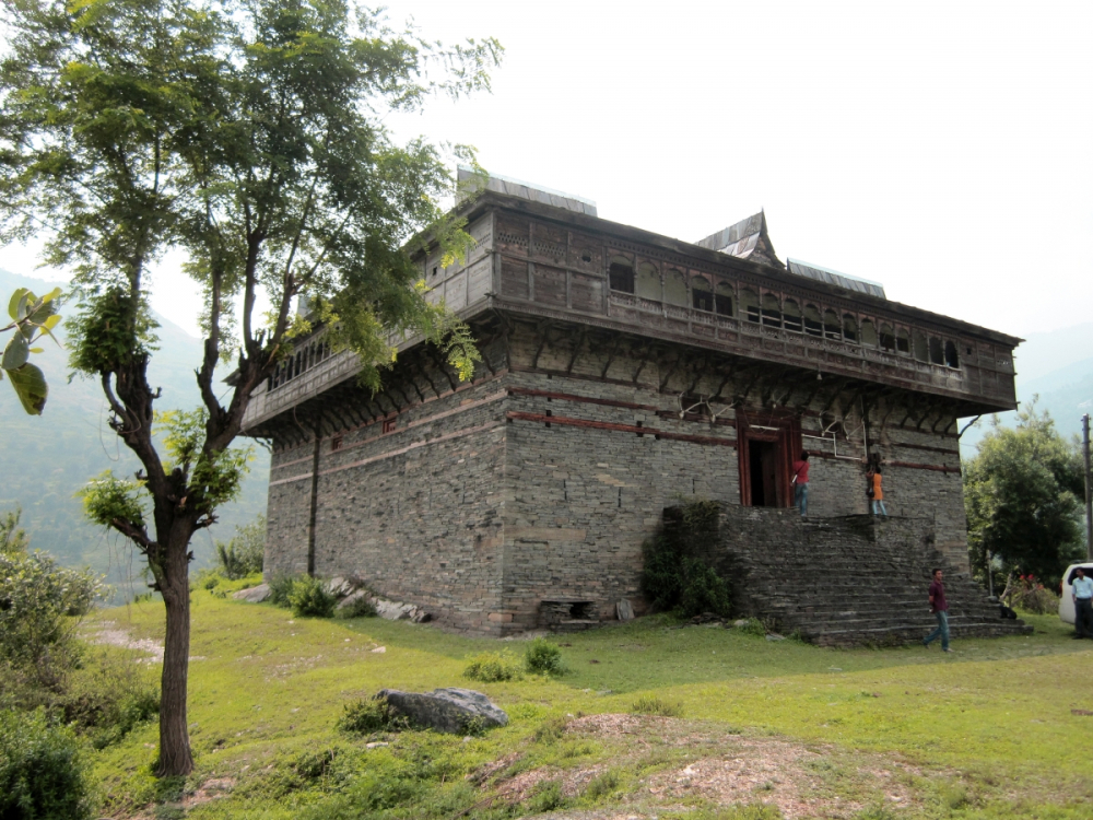 The widespread technique of kath-khuni construction can be found in buildings of various scales, from quite large darbargadhs and kots, to intricate and majestic temples, to modest houses and even small standalone structures like granaries. With its characteristic layered interlocking of wood-and-stone, topped by slate roofs, the kath-khuni buildings are easily recognizable. The technique relies upon a limited range of materials which, in turn, has evolved into a distinctive aesthetics of hard and soft materials, of cold and warm colours, of rough and smooth textures.