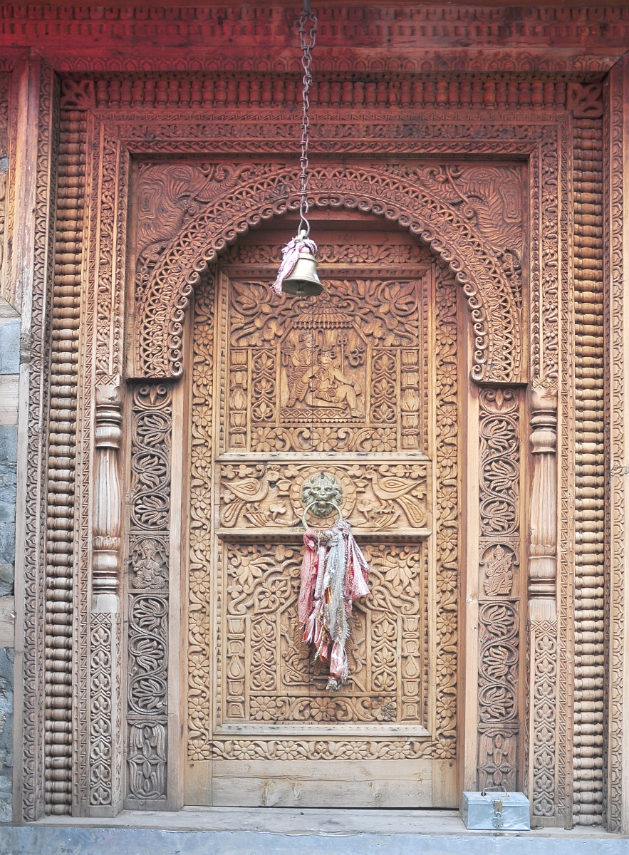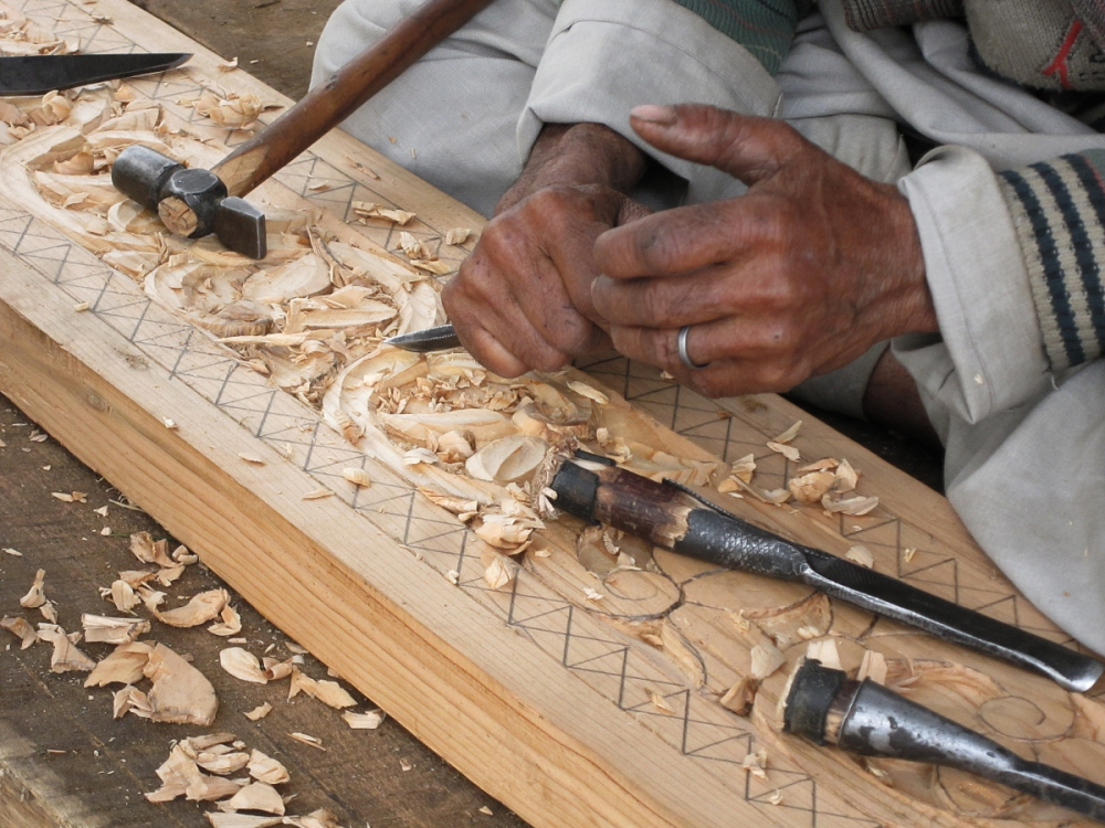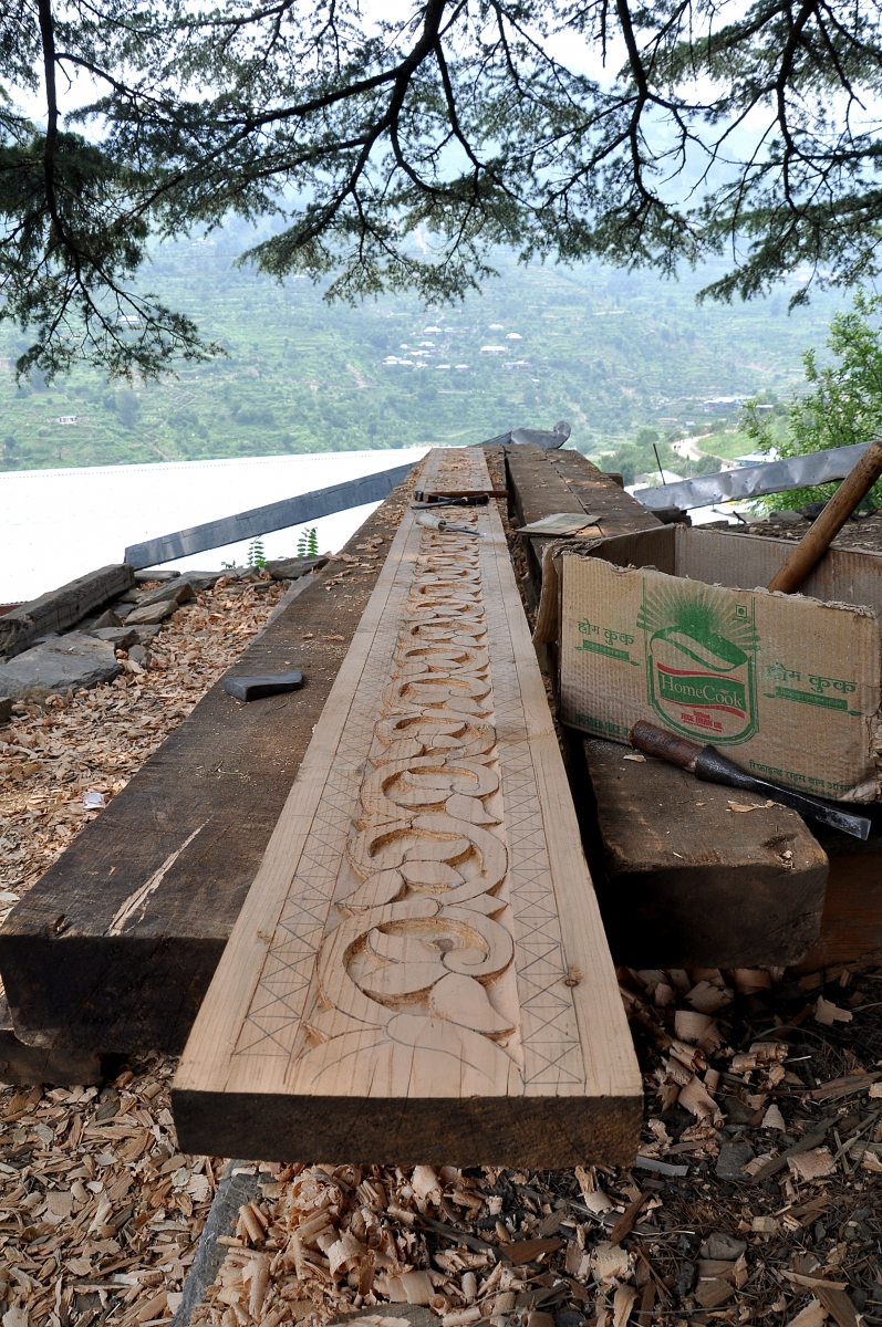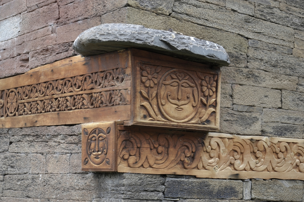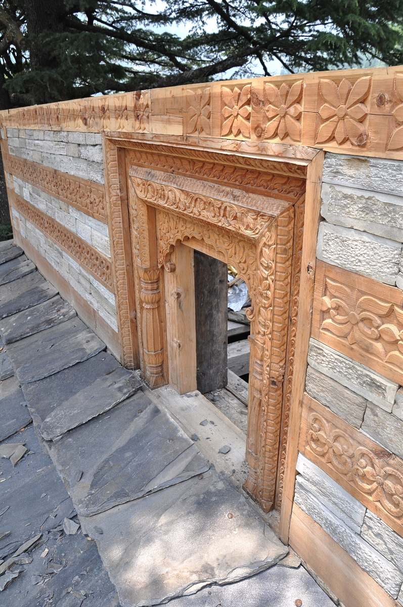Wood carving is an integral part of kath-khuni built forms and is the oldest craft of Himachal and still thrives in a number of valleys. The quality of wood carving reflects high level of intricacy and skills, as well as a highly developed aesthetic sense that fluidly integrates and expresses motifs based in folk tradition and religious references. The jhalars (wooden pendants) along the roof edge, motifs on panels and on walls and balconies, door frames and windows all are intricately carved. The themes range from folk to abstract to geometric to natural ones. They are used as standalone motifs and at other times as a part of a continuous frieze or panel. Wood-carving is also seen in kath-khuni houses, though usually not as elaborate as that in the temples of Himachal, crude carving on the door frames, balconies and ridge can be seen in many houses.