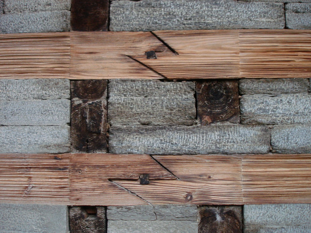 The construction from foundation to roof uses no mortar in the courses of stone; the sheer weight of dry masonry and the roof in slate stones holds the structure down in place. Traditionally no metal nails were used in wood courses instead strategically inserted wooden braces and joints held the structure together. Nail-less framework without rivets and not rigid construction allows the building to flex with the seismic waves and effectively dissipate the energy of earthquakes.