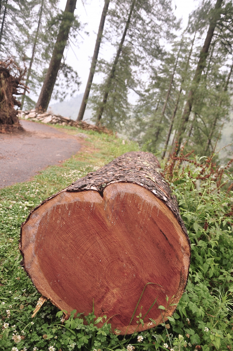 Fig. 10 & 11: Top: Himachal Pradesh is rich in timber that is especially strong and long-lasting and is therefore the predominant material of construction. Deodar is easily recognizable with its long trunk, spreading branches and dark green foliage. Bottom: Cross-section of deodar tree