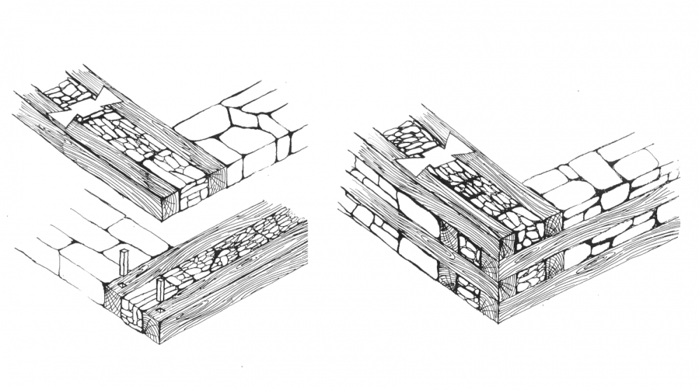 Fig. 12 & 13: A kath-khuni wall is constructed by laying two wooden wall beams longitudinally parallel to each other. This defines the width of the wall. The edge members are lap jointed and secured by a kadil (wooden nail). This arrangement of alternating stone and wood add flexibility and has proved to be a good safeguard against frequent seismic tremors.