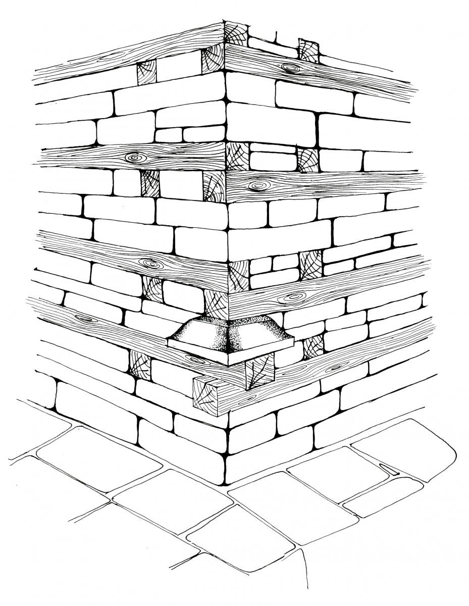 Typical construction begins with preparation of the ground; the trench is dug relative to the height of the structure, which is then filled with loose stone blocks which rise up to make the plinth. The raised podium provides the stability to the house or tower and also protects the building from snow and ground water.
