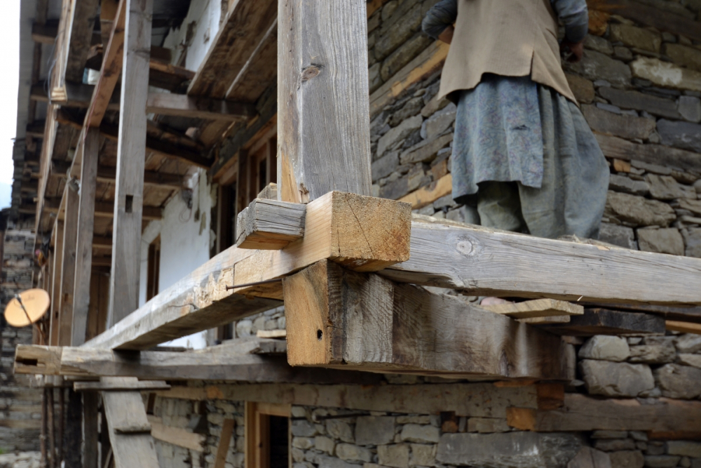 The next space integral to the house is the cantilevered balcony, projecting either on one or all sides of the structure, which rests on the wooden beams fixed in the wood-and-stone walls. A wooden roof frame tops off the structure and is covered with locally available slate tiles. The basic structure of the balcony is secured in walls and details such as parapets, fascia boards and panels are incorporated later. Balconies used to be open but with the passage of time, various forms of enclosures are now observed. The supporting wooden posts also support the roof structure, in many cases are molded and richly carved.