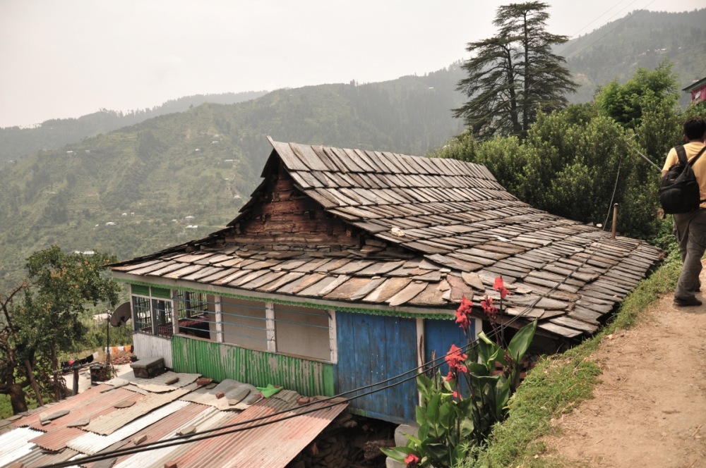 The last phase of construction is the roof which is made to rest on wooden beams followed by purlin and rafters, it has substantial overhanging and is covered with slate stone or wooden shingles. The geometry of the roof is usually pent and gable but several variations are observed. The pitch and geometry of the roofs changes as one climbs to higher altitudes in Himachal Pradesh. The completion of the roof is marked by laying the ridge beam.