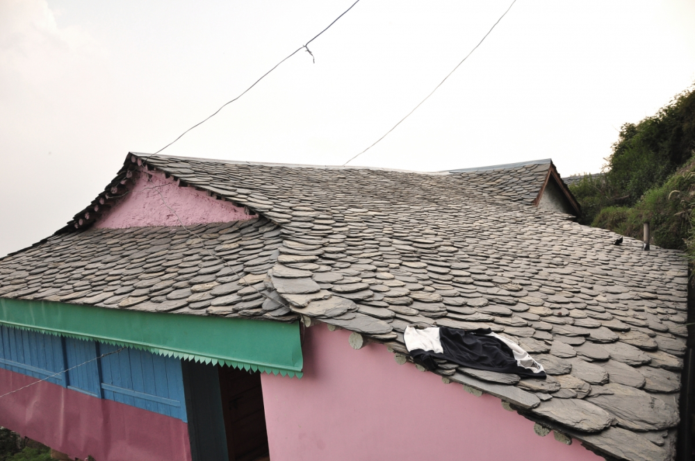 Fig. 19 & 20: Houses showing pent-and-gable roof finished in slate stone in proper rectangular shapes and the image on right shows randomly shaped stones arranged in a house in Janog village.