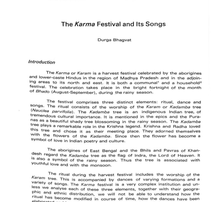 In this article, Durga Bhagvat looks into the Karma festival, the harvest festival celebrated in parts of Madhya Pradesh and the adjoining states, along with the story behind the festival, the rituals, songs and dances associated with it.