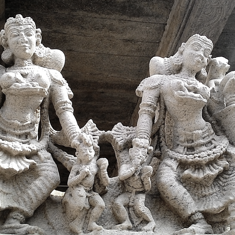 Tartakov studies the caste dimensions of the mandapa suggesting that the mandapa, located furthest away from the garbhagriha (inner sanctum) was meant for the floating population belonging to various social groups that visited huge temple towns during the festival period (Tartakov 2012). This perspective throws light on the inclusion of peripheral figures like the kuravan and kuratti within mandapa complexes, where they might have been viewed by a growing population of lower professional classes such as potters, craftsmen, ironsmiths among others. These communities of people including the professional, artisanal castes (shudras) had become donors to larger temple complexes during the late medieval times. This interesting development post sixteenth century could be linked to a renewed confidence in the lower social groups to access larger temple economy due to social mobility. Cynthia Talbot, in her study of the above phenomenon through donor inscriptions, also suggests that their desire to contribute as donors to larger temples had to do with their own physical mobility and the desire to participate in pilgrim economy, apart from seeing themselves as rightful stakeholders in political and religious affairs, in keeping with the ascent of the Shudra kings—the Nayakas (Talbot 1991).
