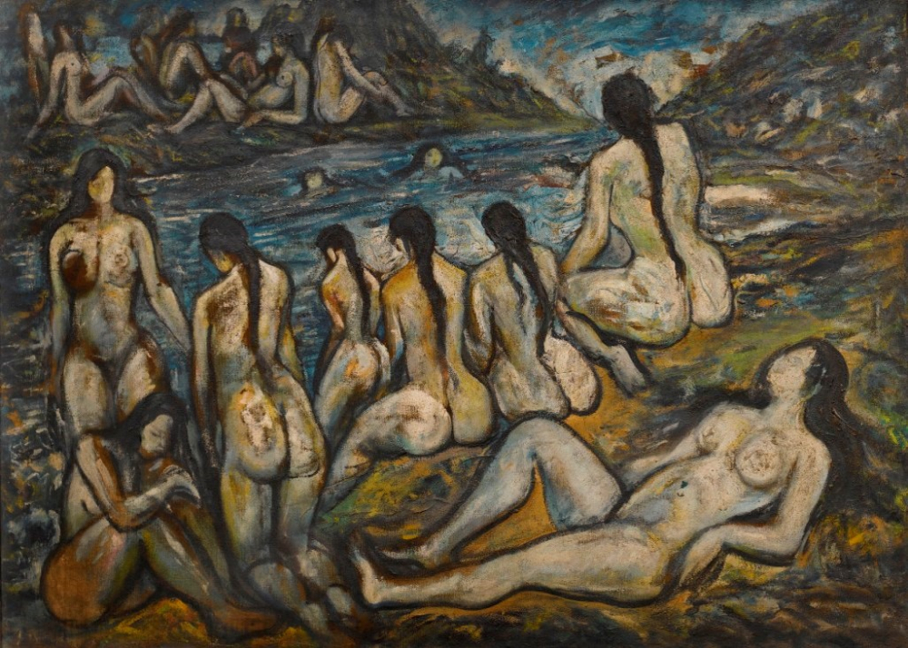 In his portrayal of bathers, Abani Sen was reinterpreting a long tradition of composition with nude figures in the landscape, by both western and Indian artists. With bathers, Sen attempted both an intimate and a detached study of the subject. For many of these images of women, he adopted un-idealized features to show a variety of physical and emotional states. He often painted two, three, or groups of nudes in various poses, dovetailing skillfully to create a captivating ensemble of female figures in nature. These multi-layered works are an analysis of the complexities of human emotions apart from being brilliant studies of the female nude. Each of these faceless women tell a story of vulnerability, unbridled sexuality, or female bonding, through as banal an act as bathing.