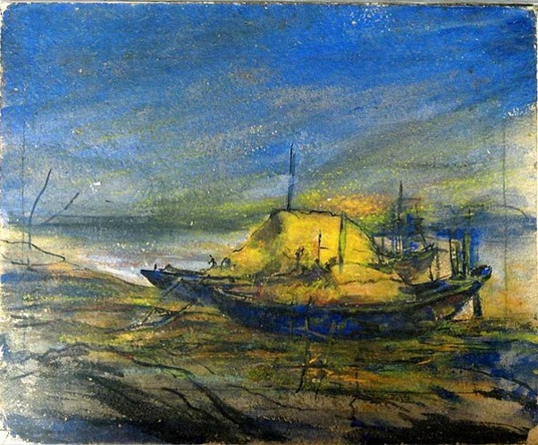 'After a Long Day' creates an image of thoughtful stillness on the banks of the river Hooghly. Compositionally, the painting is divided into two horizontal strips with a horizon line dividing the sky and the earth. The lower half is further divided by a diagonal line separating the river and the ground. This balanced composition draws the viewer’s eye to the brightly lit boats at the centre of the painting, which are anchored to the shore. The canvas roofs of the boats are lit in yellow light from inside. After a long day, the boatmen are perhaps cooking, eating and resting inside their makeshift homes. The ground is coloured in muddy brown, mossy green and black, in contrast to the cobalt blue of the sky. By rolling a yellow pastel sideways on the surface of the painting, Sen sprinkles the yellow light from the boat across the sky as well as the land. The lively evening sky becomes the sensitive backdrop for the composition. The pale grey water takes on bits of colour from the sky, the ground, and the boat.