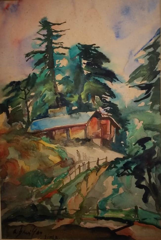 Easily accessible from Delhi, the beautiful environs of Shimla kept luring Sen time and again and became a recurring subject in his works. Shimla presented him with a landscape which was very different from that of Bengal. With its undulations, plummeting cliffs, basins and clearings seen from above, mountain roads descending vertically etc., Sen articulated the space in the Shimla landscape more dramatically.