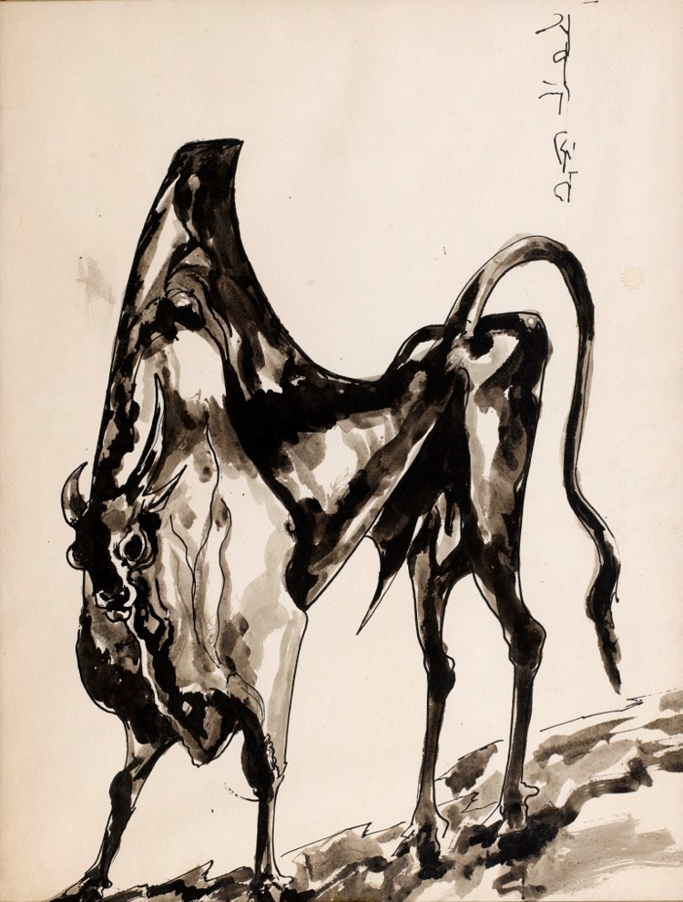 The ink drawing titled 'Stud Bull', though painted much later, harks back to the most challenging period of Sen’s life in the 1930s when he was under financial strain. Here, the starving bull personifies Sen in his anguish and misfortune, in his grit and determination, and in his pride and dignity. The lone figure of the stud bull is spread across the vertical space diagonally, and is balanced by a very tall hump. Sen used angular lines to delineate the form of the animal projecting the hip bones, thighs, and the joints. The face, with its flaring nostrils, and ringed nose has a determined expression. The bull looks at the viewer with confidence. This composition in black ink on paper could be mistaken for a Chinese painting. Even Sen’s signature, though in Bengali, is vertical, like those seen in the Chinese scrolls.
