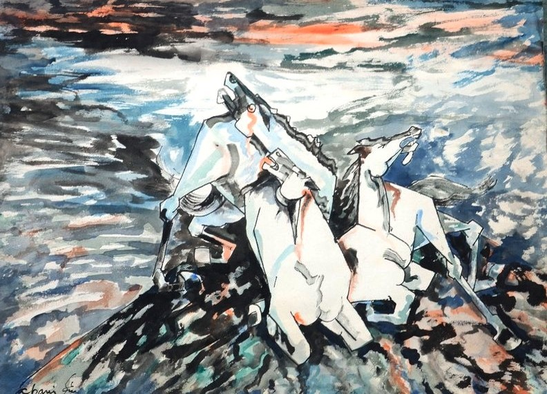 Even as the bodies seem to have captured the greatest share of his painterly caress, the sky, the ground and the river are by no means subordinate to them. Everywhere in the whole plane of the picture, modulations of colour are found balancing and contrasting each another. This finds its counterpart in a form of outline, the aim of which is not to isolate the object it encloses, but instead to form the connecting link between two contiguous colour values. The outlines of the figures are roughly mapped out in black strokes, and they convey a marvellous sense of volume. The masterly skill Abani Sen had achieved in his mature years, is evident in the way he tackles the large featureless area of the ground, deftly transforming it into a vibrant series of colours. With loose strokes of yellow ochre and green laid beneath a thrilling sequence of rich strokes of blue and black smeared with the brush and the palette knife, he made the texture of the ground resonate within the general harmony of the picture. The very blue river seems to be reflecting the sky.