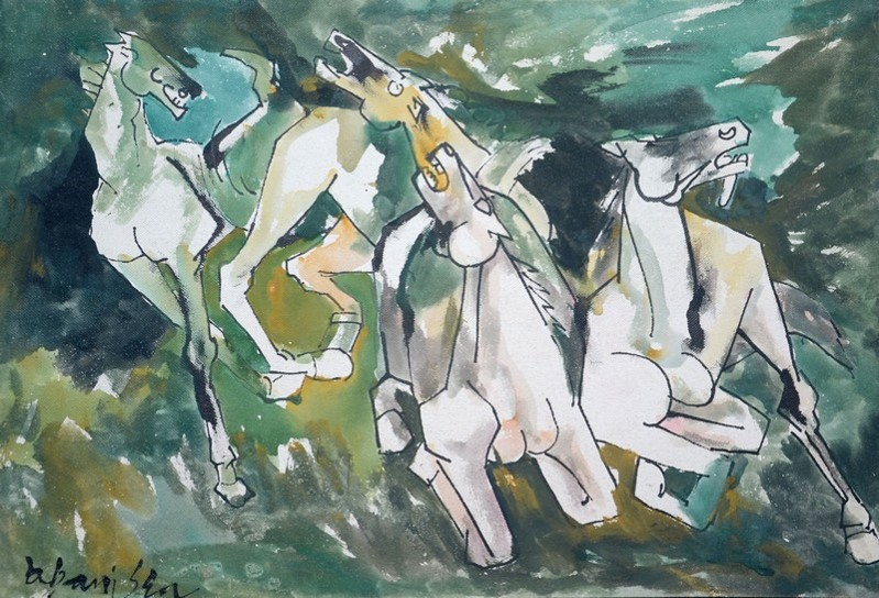 In Plate 4, two horses are seen wading through a riot of colours which stylistically aligns with the cubist approach. Divided into variously shaped compartments, the horses in the centre also appear to be a part of the same design. Sen outlined the forms in black and filled in the various sections in bold hues of reds, yellow ochres, greens, and blues. Interestingly, the brush strokes were in the same direction as the outstretched limbs of the horses, creating a sense of momentum, yet they look like delicate paper cut-outs.