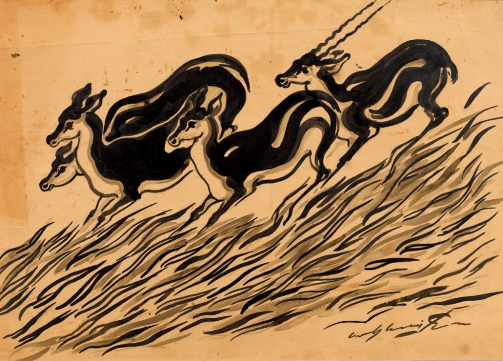 The charming monochromatic painting called 'Speed', done in the early 1930s is simply throbbing with life. It shows a herd of deer running at high speed, cutting across the composition diagonally. The group consists of three female deer and a male identified by its antlers. The stirring motion of the grass in the reverse direction enhances the speed of the deer running downwards from right to left. The rhythmic wavy lines of the grass and the curvy bodies of the animals resemble the dark kohl lined beautiful eyes of the deer themselves. With just a few lines and tones, Sen delicately handles the subject and retained the spirit of spontaneity synonymous with the deer.