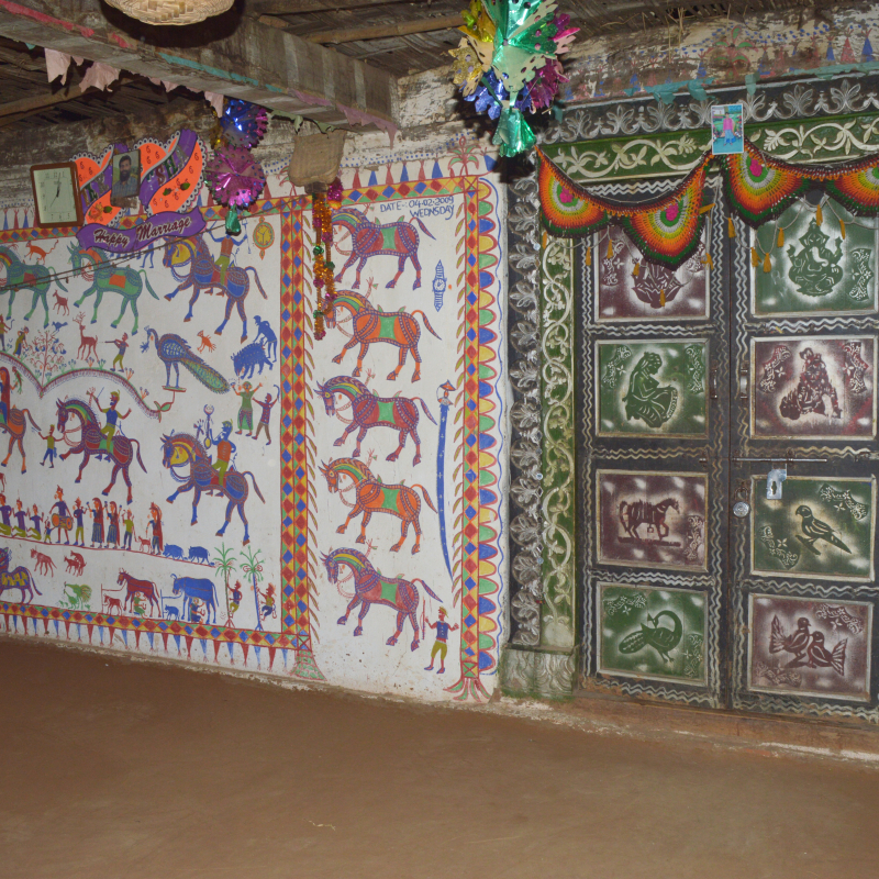 Rathva homes are built simply—outer walls are made of brick and mortar, the inner ones of bamboo with mud casing walls. The roof is sloping, thatched with wood and bamboo, dried long grass and then covered with baked terracotta tiles. The house is rectangular, divided in half. The main door of the house opens onto one rectangular half, a kind of general living room, while the kitchen and one or two rooms are on the other side of the dividing wall, with two doors opening onto them. The Pithora is painted on the long rectangular wall that overlooks the living room. The two outer walls at right angles to this wall on both sides are also used for the painting. Once the family decides to get a Pithoro painted, the wall is cleaned and whitewashed if it happens to be of brick; if it is of mud and bamboo, a fresh coat of the wet mud and cow dung mixture called lipan is applied. The dung has to be from a young cow that has never calved, and this lipan is done for seven days and allowed to dry. Lipan is supposed to be applied on the wall by the unmarried girls in the family. If the family can afford it, the rest of the house is repaired and readied as well. During this process of repair, whitewashing and lipan applying, the women in the family are joined by neighbours, singing songs in praise of Pithorodev. On the eighth day, which should be a Tuesday, the wall is sanctified and readied for the painting.