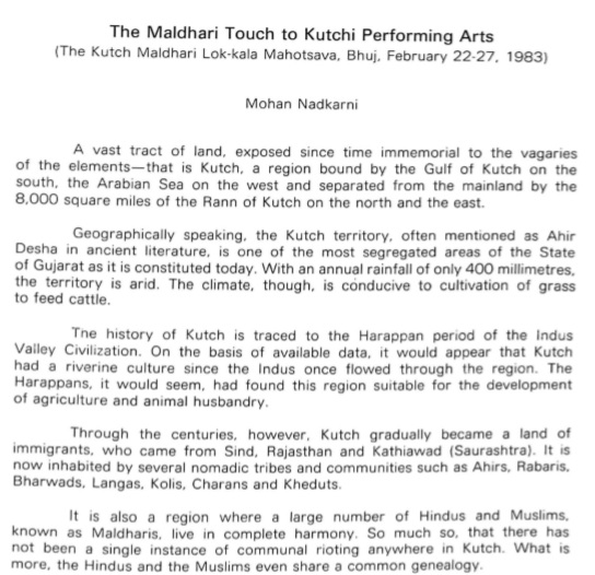 The article is an account of 'The Kutch Maldhari Lok-Kala Mahotsava', Bhuj, that took place on February 22-27, 1983.