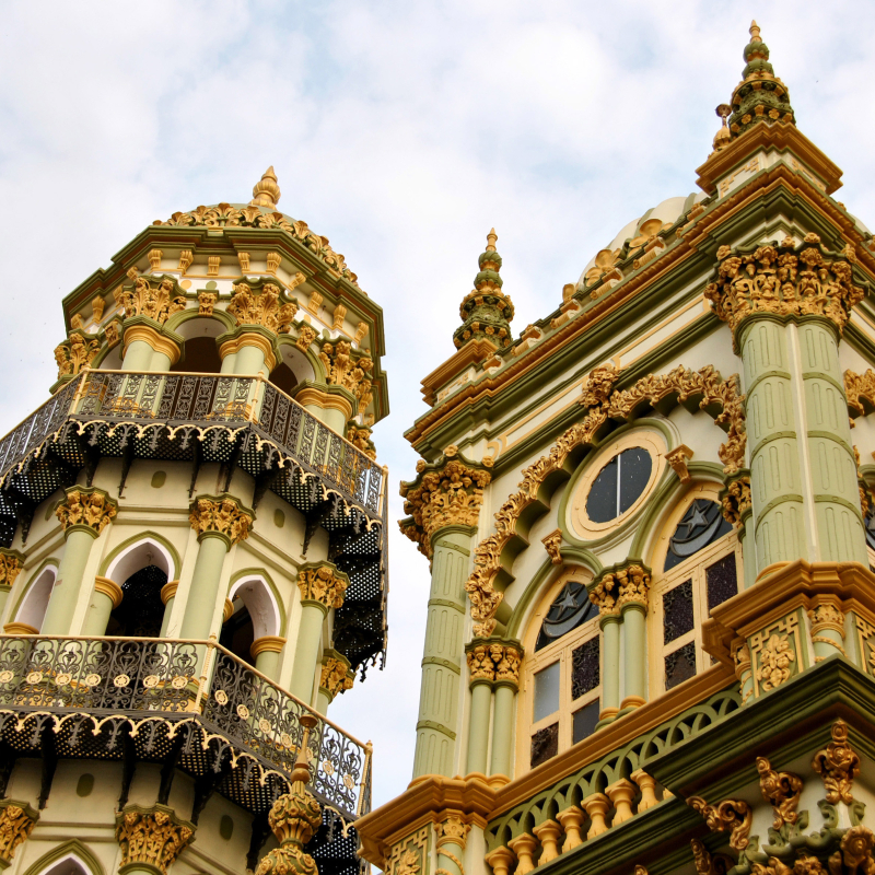 The mosque is essentially an architectural edifice that reflects amalgamation of various styles that the invaders and traders brought with them: the Arabs, Mughals, Portuguese, and Dutch. It has withstood several catastrophic events that occurred over time: floods, earthquakes, cyclones and occasional fires, which validates its structural resilience and the wisdom behind its construction techniques. It is a two-storeyed structure with three minarets, exquisite carving and details that make it a landmark. As one looks closely, the architectural styles identified are as follows: vernacular, colonial, baroque and Arabesque, an eclectic mix which has been carefully designed with visual harmony and proportions that appropriate the building within the setting.