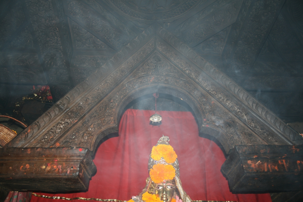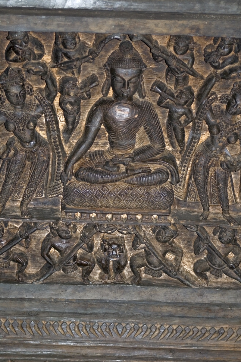 The next alcove is the one in the back with the red-coloured figure of Maitreya. Considering his destiny as the successor of the last historical Buddha Shakyamuni, it is not surprising that his dhoti is painted with scenes from the Life of the Buddha. The Tathagata that sits in his crown is Vairochana, who is associated with the historical Buddha, as is previously mentioned. But the Tathagata that recurs in miniature form on the sides of the back wall is Akshobhaya. One explanation for the dual association may again be found with the theme of the historical Buddha. Akshobhaya performs the bhumisparsha mudra or the earth-touching gesture that Siddhartha Gautama had performed to call upon the earth to witness his enlightenment transforming him from a seeker or Bodhisattva into the Buddha. The niche in the right wall contains the yellow Manjushri, whose dhoti is painted with the 84 Mahasiddhas, yogis or ascetics who obtained special, magical powers through unconventional means.