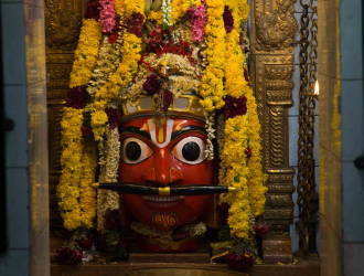 According to these versions of the epic, Arjuna was married to the princess during his one-year exile in India’s Northeast. Aravan grew up as a splendid Naga warrior and participated in the battle of Kurukshetra on behalf of the Pandavas. On Krishna’s request, he offered himself as sacrifice to appease Goddess Kali, which was necessary to ensure victory for the Pandavas. Krishna, who was the main strategist for the Pandavas, offered Aravan three boons for his selfless act. His first boon was that his death in the battlefield would be heroic; the second boon was that he would be able to see the entire battle of Kurukshetra even after death. The third and final boon was that he would be married before he dies. Since no woman was willing to suffer imminent widowhood, no one volunteered. To fulfil Aravan’s third wish, Krishna transformed himself into the enchantress Mohini and married him. The marriage was consummated, and the next day Aravan offered himself in sacrifice to Kali. Mohini was heartbroken and mourned her widowhood, before she transformed back to Krishna. Of the three boons granted by Krishna, the first and third boons are ritualised by the Kuttantavar cult at the Koovagam festival, while the Draupadi cult includes only the second boon in their rituals.