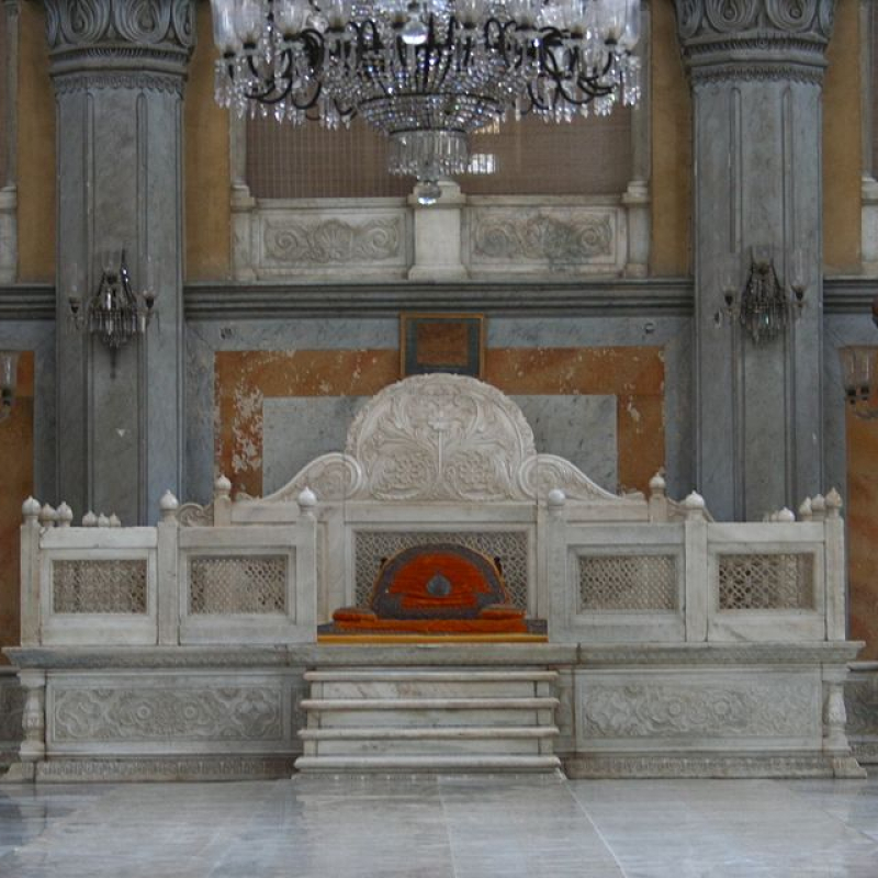 While the Takht-e-Nishan does not have any jewels or gold on it, it is surrounded by 19 awe-inspiring chandeliers made of Belgian crystal (Nagarjun Kandukuru/Wikimedia Commons)