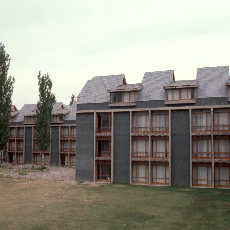 Stein’s most notable contribution to Srinagar is the Sher-e-Kashmir International Convention Centre (SKICC), designed with remarkable sensitivity to the landscape (Dal Lake and precinct) and local materials. He is also credited for the selection of the site; reportedly specifically recommending a lakefront location. His meticulous planning ensured harmonious integration with the Zabarwan mountain range and Dal Lake. Completed in 1977, the complex comprises a conference centre and a hotel. The conference facilities are grouped in a structurally symmetrical configuration, the block supported by eight massive piers and interlocked beams. The exterior is a precisely articulated concrete frame, expressive of the structural scheme. While the walls are clad with concrete blocks of exposed green aggregate, crushed from local stone, the roof is clad with blue-grey local slate.