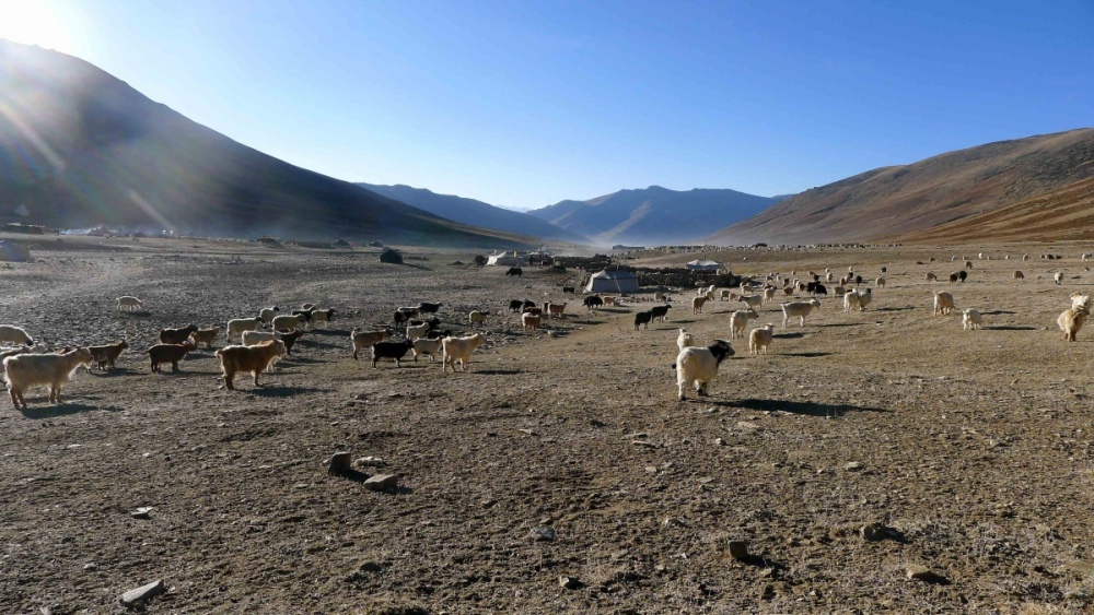 Fig. 1: Pashmina goats and tents in the Changthang. (Photograph by Tsering Wangchuk Fargo, 2016)