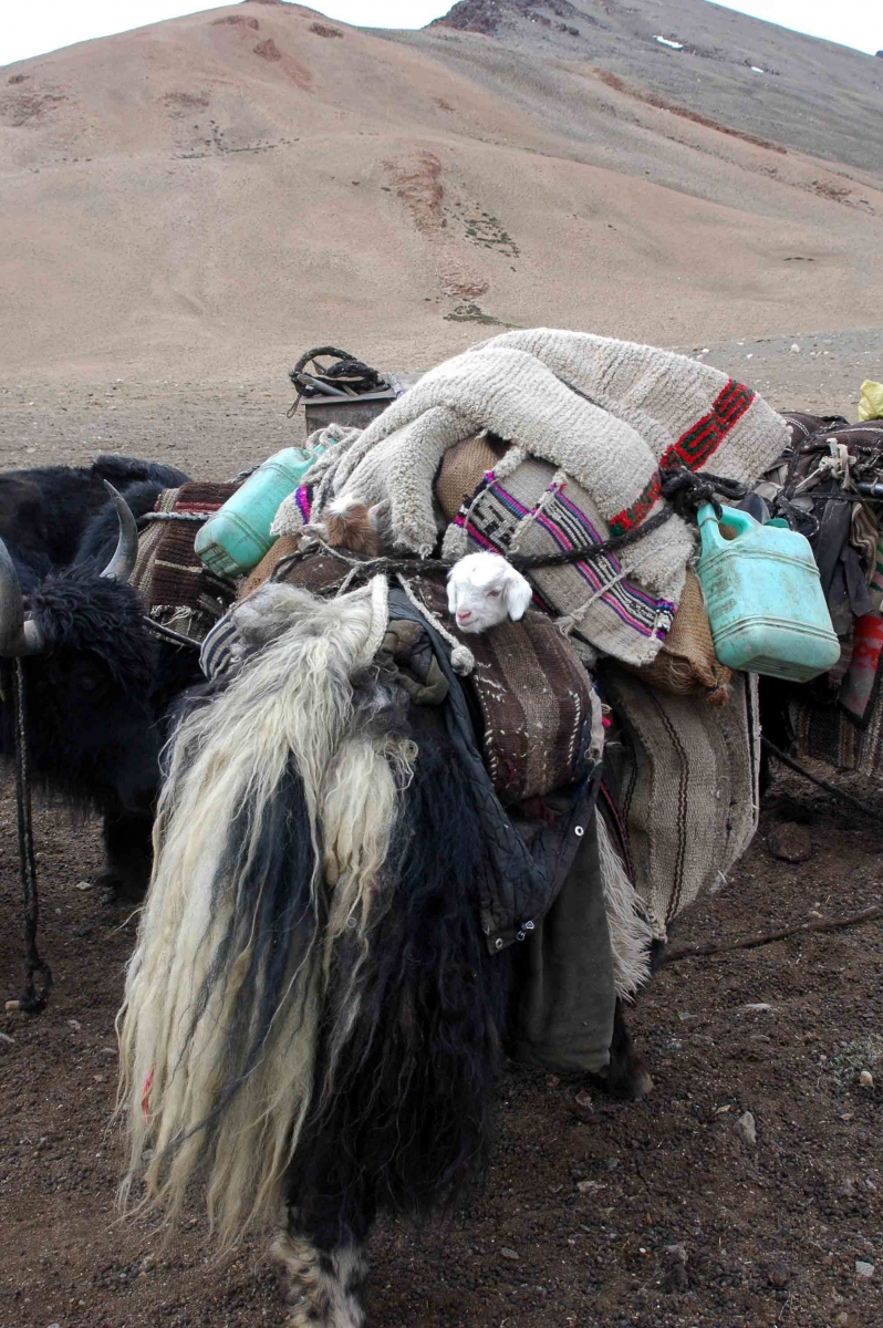 Fig. 10: During migration, in 2006, a baby pashmina goat is secure in her saddlebag as she rides on the back of a yak. (Photograph by Monisha Ahmed, 2006)