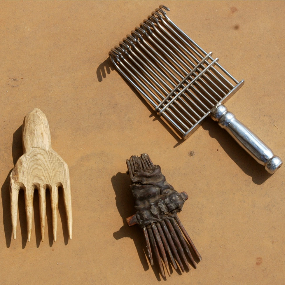 Fig. 3: A selection of old combs made from wood and yak horn (left and centre). Also seen in the picture (right) is a modern-day steel comb. (Photograph by Monisha Ahmed, 2008)