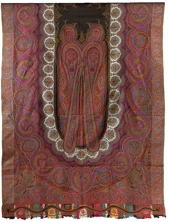 Fig. 4: Maharaja Gulab Singh and members of his royal family were quite fascinated by pashmina; miniature paintings often show him with an exquisite shawl draped around his shoulders. This piece is said to have been given as a tribute to Maharaja Ranjit Singh. The elaborately patterned shawl with a flamboyant design circling the body in a continuous oval, is said to be the creation of a French designer working with local Kashmiri artisans. Kashmir, mid-19th century; Hand-spun and hand-woven pashmina; 133 x 220 centimetres. (Photograph courtesy: Saffronart)