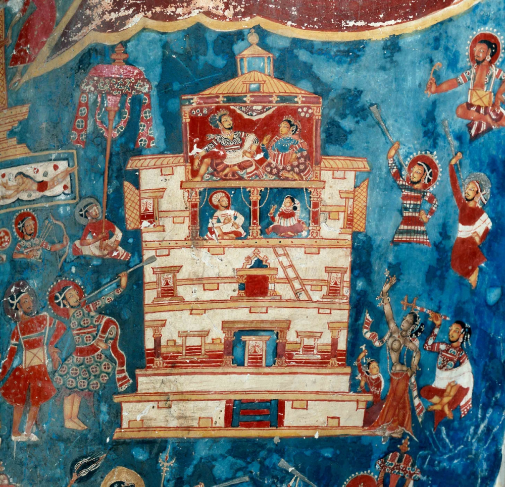 Fig. 5:  Paintings on the Avalokiteshwara statue at the Sumstek Temple in Alchi show a royal family sitting in their palace; both the queens are draped in what resemble shawls. (Photograph by Jaroslav Poncar)