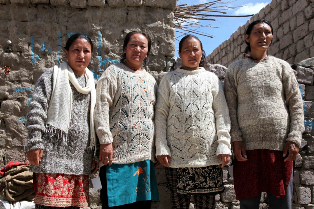Fig. 7: Women from a local cooperative of nomad women pose in the sweaters they have knitted from pashmina. (Photograph by Monisha Ahmed, 2017)