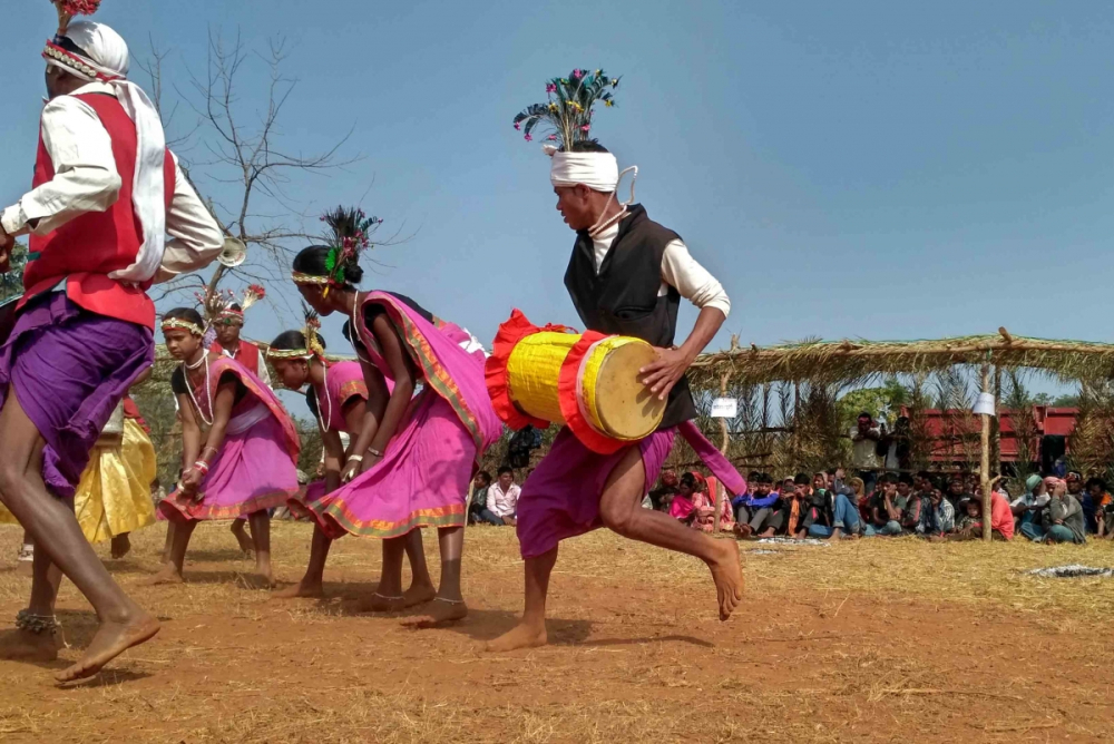 As the paddy crop ripens and the season of harvest starts, the air gets nippy in the southern hinterlands of Satpura. November slips away as the ripe golden crop sways in the cool breeze and women start reaping the harvest. Harvesting ends as December brings with it the winter winds. The Gond villages prepare for the Poush Kolang; hand in hand, the adivasis dance for hours, singing rela. After the full moon of Poush (the early winter month of the Saka calender), Gonds offer their first harvest to their ancestral gods. Following this, villages and towns across Gondwana (eastern Madhya Pradesh and Chhattisgarh) organize Madais or fairs. These fairs continue throughout winter and stretch up to the month of Chaitra as spring gives way to summer. This extended stretch of time across which the Madais are organized also gets punctuated by various festivals of both the Gonds and the Hindus which are celebrated in varying degrees by the people of Gondwana.