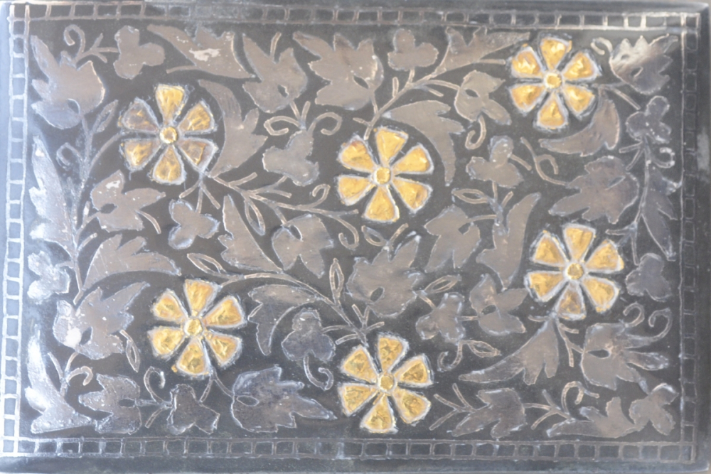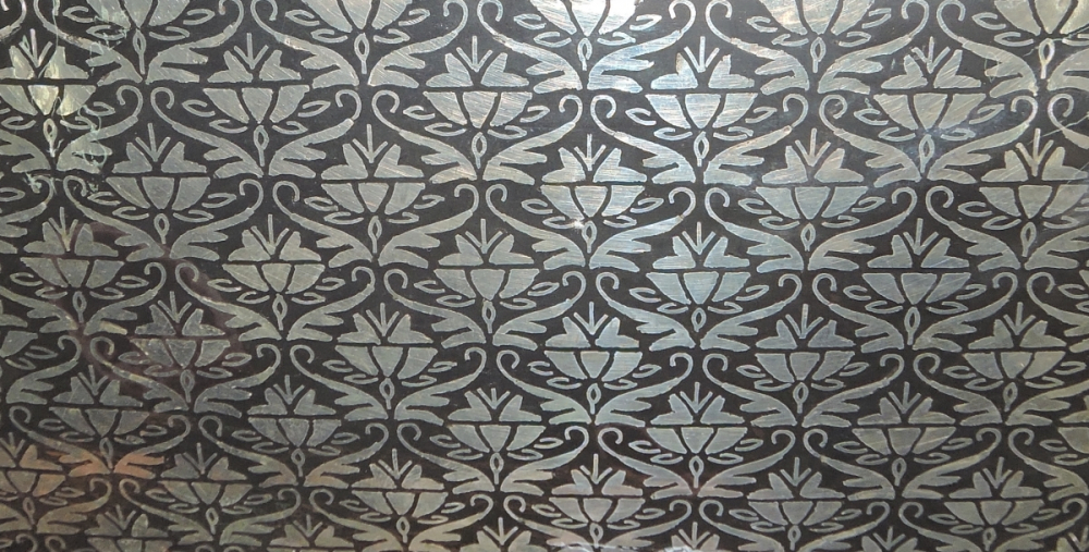 2. Aftabi, also known as mehatabi, refers to silver inlay on the background while the designs appear to be in black. This work requires high skilled labour and is extremely time-consuming. The required designs are first drawn on to the surface of the object and the remaining background is engraved leaving aside the design, on which silver is further inlaid. Aftabi designs use silver sheets instead of silver wires as silver sheets help cover larger spaces on the background compared to silver wires. Teh nashin and aftabi are the exact opposite of each other.