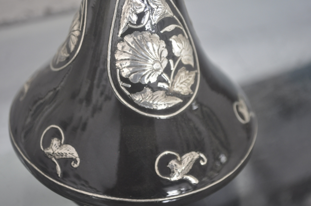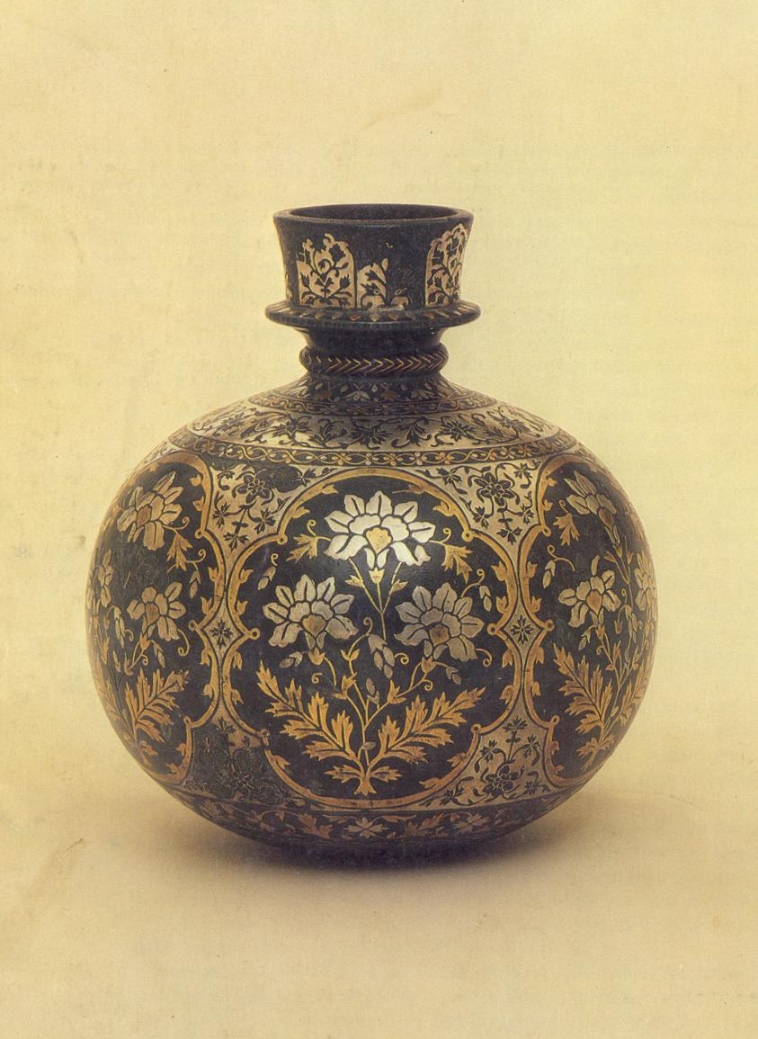 1. Teh nashin refers to ‘thick inlay of gold or silver in deep engravings on a baser metal surface’ (Sen 1983:37). This is most common in early bidri and is still in practice. The designs are done in silver against a black background. The designs are flushed with the surface of the metal without any relief. The required floral pattern is engraved on the surface of the metalware and then inlaid with silver.