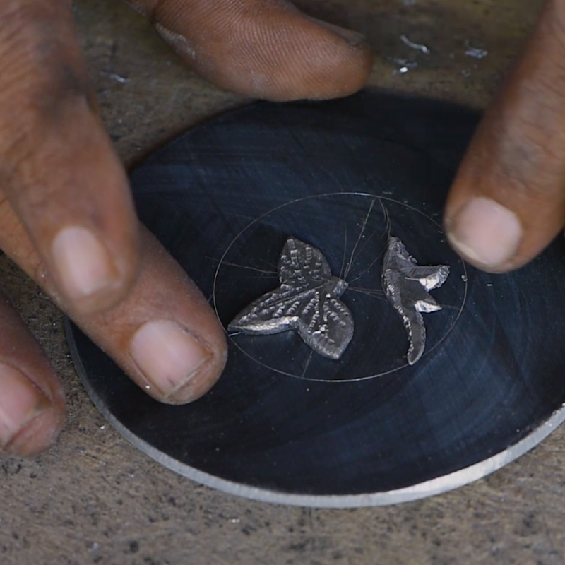 Zar buland, as mentioned earlier, is lead-based silver inlay. During this process, once the moulding and designing is done, deep grooves are made for the motifs onto which lead, which is a soft metal that can be moulded easily and can be cut as per the size of the groove, is fitted inside the groove by slightly beating with a hammer. Small dots and lines and made on the lead pad on which a silver sheet is then traced neatly as per the design, the extra sheet is then cut with a chisel. The silver sheet is similarly beaten with a hammer for it to fit onto the lead pad and the sides are neatly outlined with a chisel, hammering the silver in a way it doesn't fall out.
