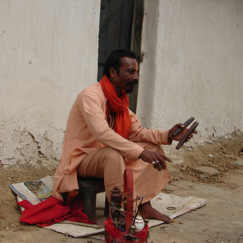 Image: Ram Prasad Vasudeva receiving offering from a woman/राम प्रसाद वासुदेवा एक औरत से दान लेते हुए।