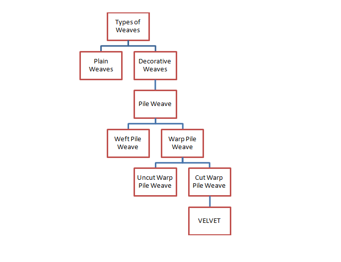 Velvet fabric falls under the category of warp cut-pile fabric. It is important to understand this technical definition. Weaves are classified into two broad categories, namely plain weaves and decorative weaves. Plain weaves are formed by bringing about variation in the interlacement pattern of the warp and weft yarns, i.e., the two set of yarns used to weave a fabric. There are no supplementary yarns used. Decorative weaves on the other hand use a third set of yarns to create patterns in the fabric being woven. Under the category of decorative weaves, when a set of supplementary yarns isused in the warp direction, and these yarns create loops and further these loops are cut to form tufts, this technically forms a velvet fabric. Innumerable weaves can be mentioned under each category due to the variations that can be carried out in the interlacement pattern, however, for the sake of understanding the construction of velvets, subdivisions of the relevant categories have been mentioned.