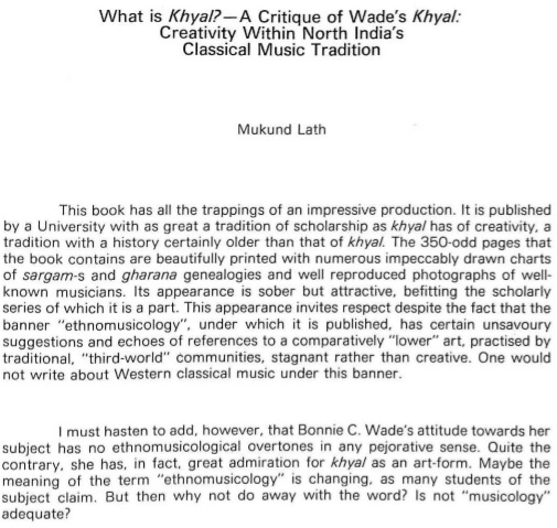 Mukund Lath writes a critique of Bonnie C. Wade's Khyal (Cambridge University Press, 1984). Journal Author Name Indraprastha College Archives Author Name Mukund Lath Date of publication 1st Jan 1988 Volume no 17 Issue no 1