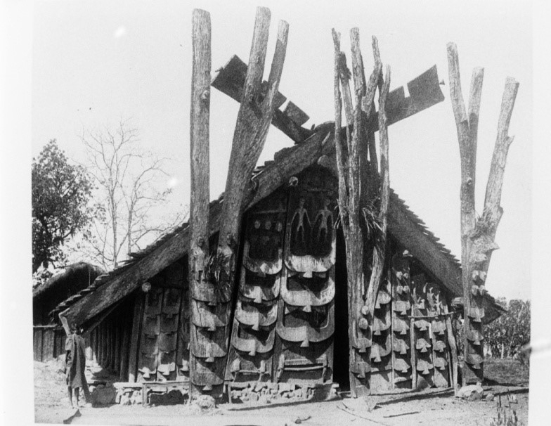 A lot of animal motifs like those of tiger, elephant, monkey and snake were depicted besides the inevitable mithun and the hornbill. Each animal was symbolic of a particular quality or character that was highly regarded in those times, like courage, strength, fighting prowess. Besides these, there were many other woodcarved motifs that found place on the totem-like front posts, or walls of chiefs' houses or men’s dormitories called the morungs. There were breasts that spoke of love conquests amongst the Sema chiefs, meat chunks that represented feasts of merit given by the house owner, and sun, star and moon representations as natural spiritual elements, and daos (multipurpose machete) and spears praising the warrior status and prowess of the morung members. The men’s dormitories (morungs) had the most elaborate and impressive of wood carvings and distinct architectural styles and were positioned in special sites in the settlement.